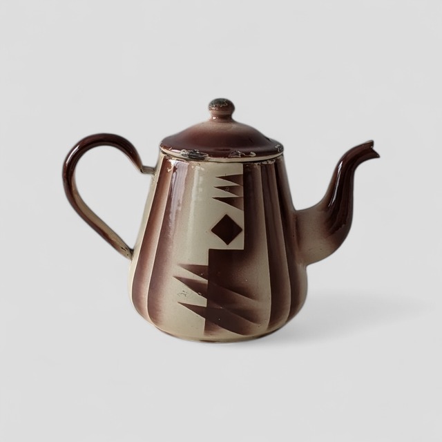 ベルギーのアンティークマーケットで仕入れたアールデコデザインのホーローのポットです。 茶色+クリーム色の幾何学模様。柄は、釉薬を吹き付けて加工しているため、境目がぼやけたアンティークにしかない味わいがあります。 どこの国のものかは定かではないのですが、フランスかベルギーかドイツのものだと思います。 小さめのサイズですので、キッチンでも場所を取らないサイズ感。 実際に直火使用は可能かと思いますが、古いものですのであまりお勧めしません。 経年による欠け、錆など多数あります。 最大高さ16.5cm、最大幅22cm、開口部φ8cm、蓋φ8.5cm 20世紀初頭 ―――――――――――――――――――――――――― 【アンティーク品に関するご注意事項】 ○用途について:当店の食器類はすべて「装飾用」として販売しております。実生活でのご使用については、お客様の判断と責任にてお願いしております。 ○状態について:50年〜100年以上前の古いお品物が中心です。経年変化による損傷(小傷・変色等)があることを前提にご検討ください。 ○検品について:特筆すべきダメージは明記しておりますが、アンティーク特有の細かなコンディションの違いを理由とした返品は承りかねます。古いものの特性をご理解の上、お買い求めください。
