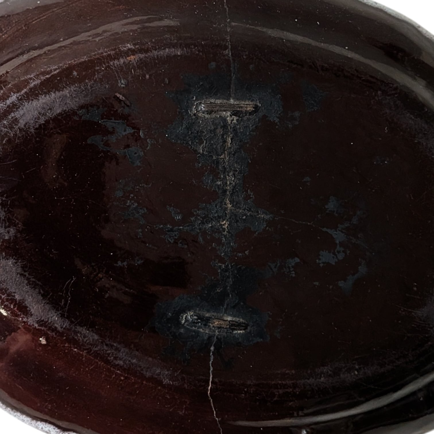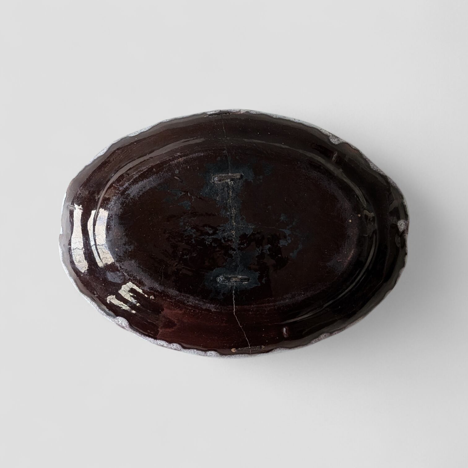 裏側はキュ.ノワールと呼ばれる黒褐色で、その理由として表側はファイアンスと呼ばれる錫釉仕上げですが、これがなかなか高価らしく、裏側は安価なマンガン釉が使われています。表裏の色が違うのはそういう理由。