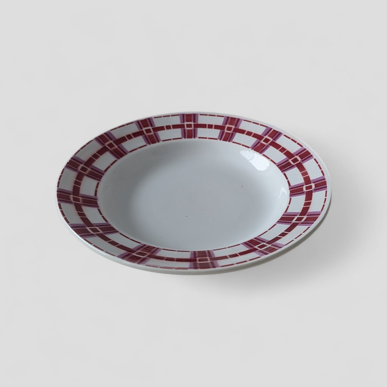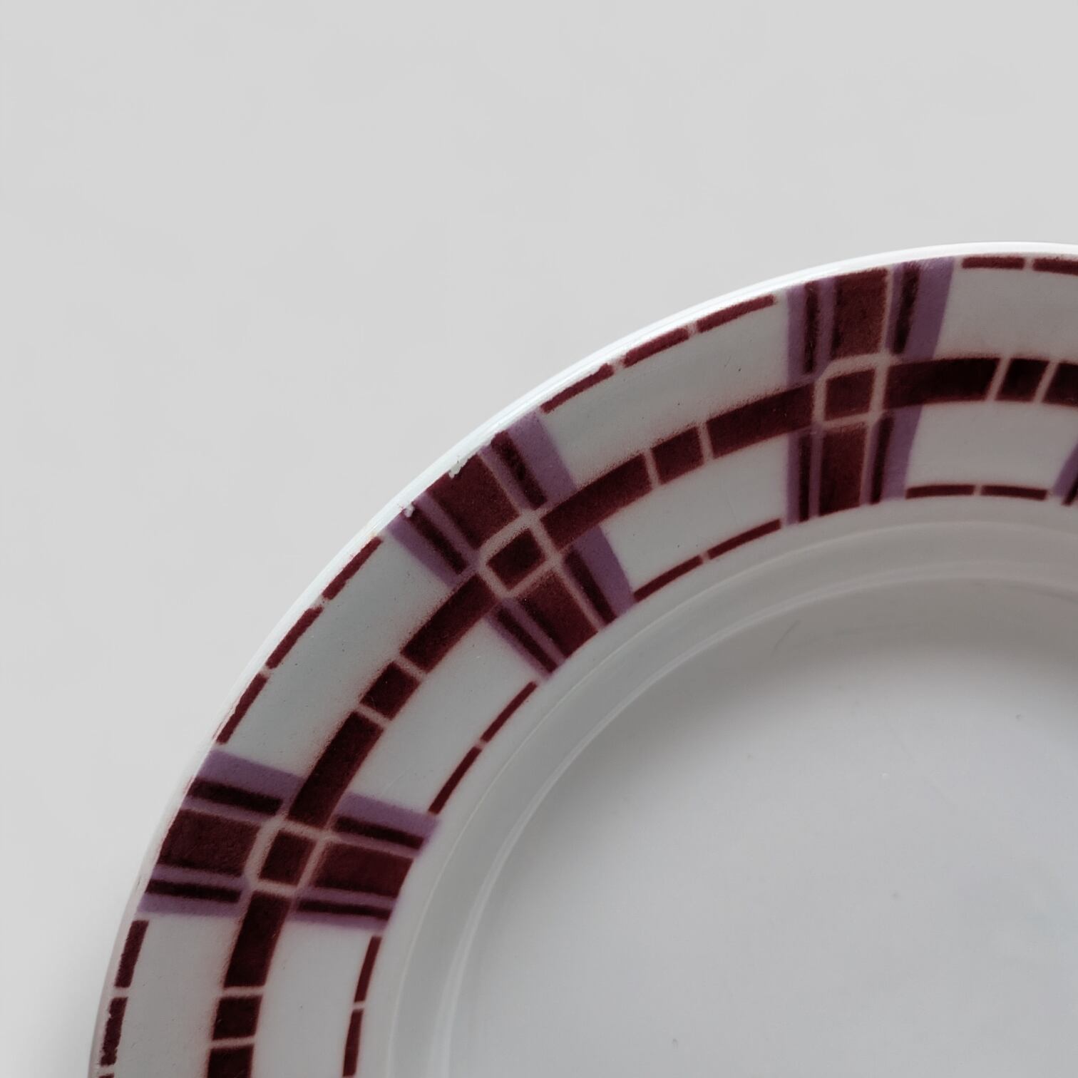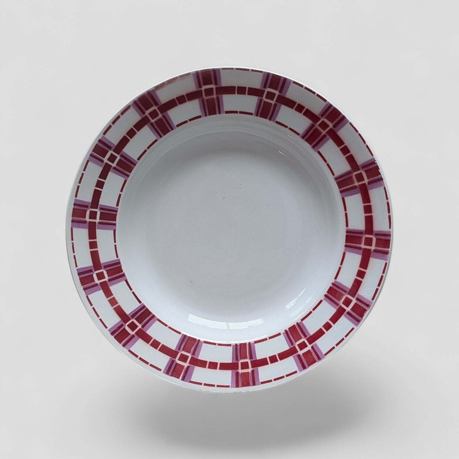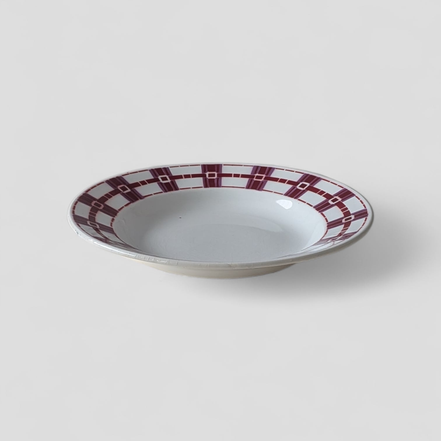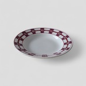 白に近い象牙色にエンジ色の幾何学模様が配してあります。