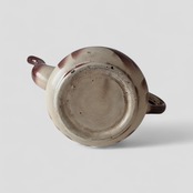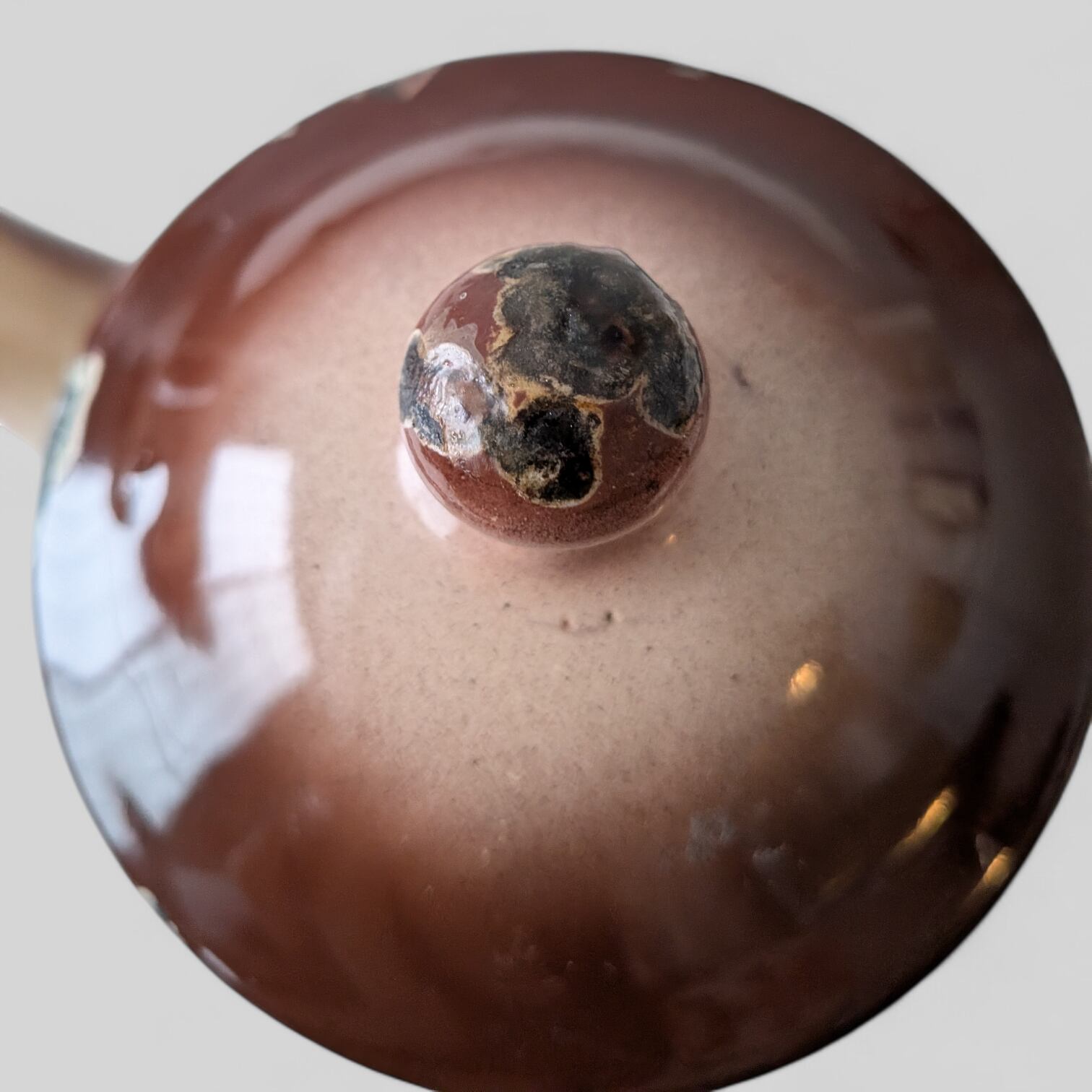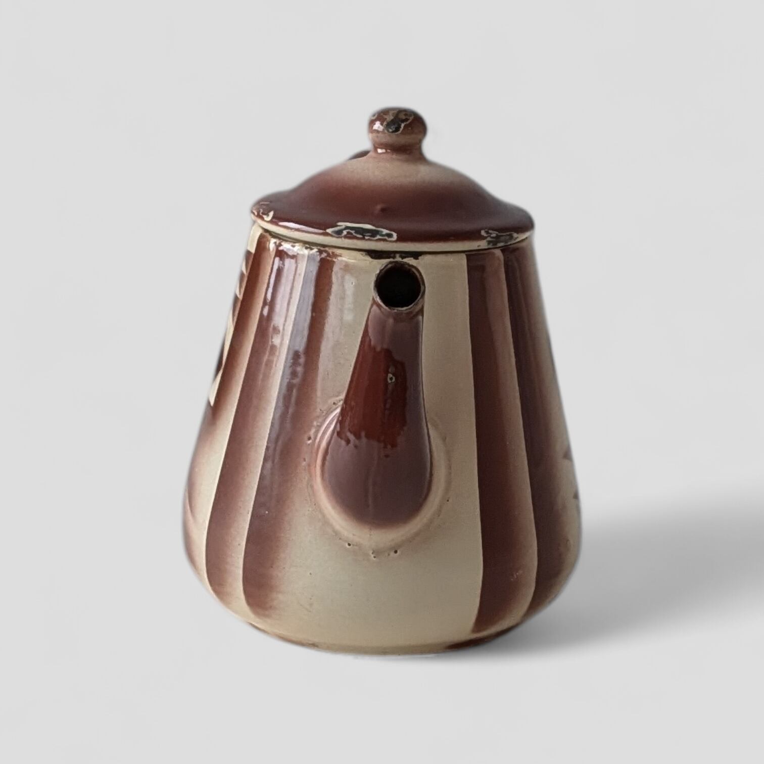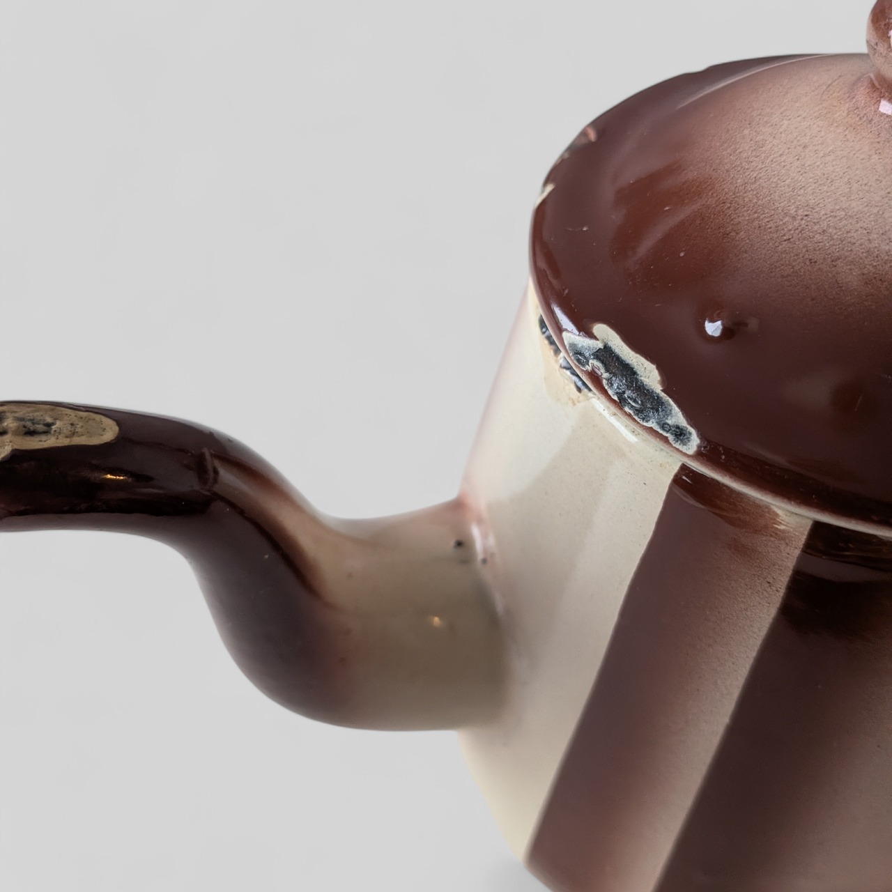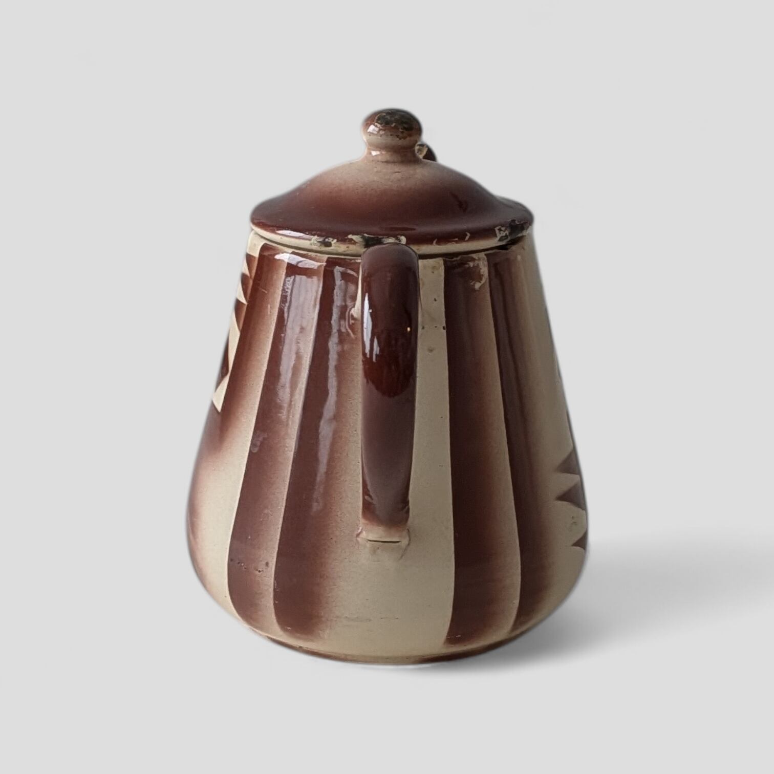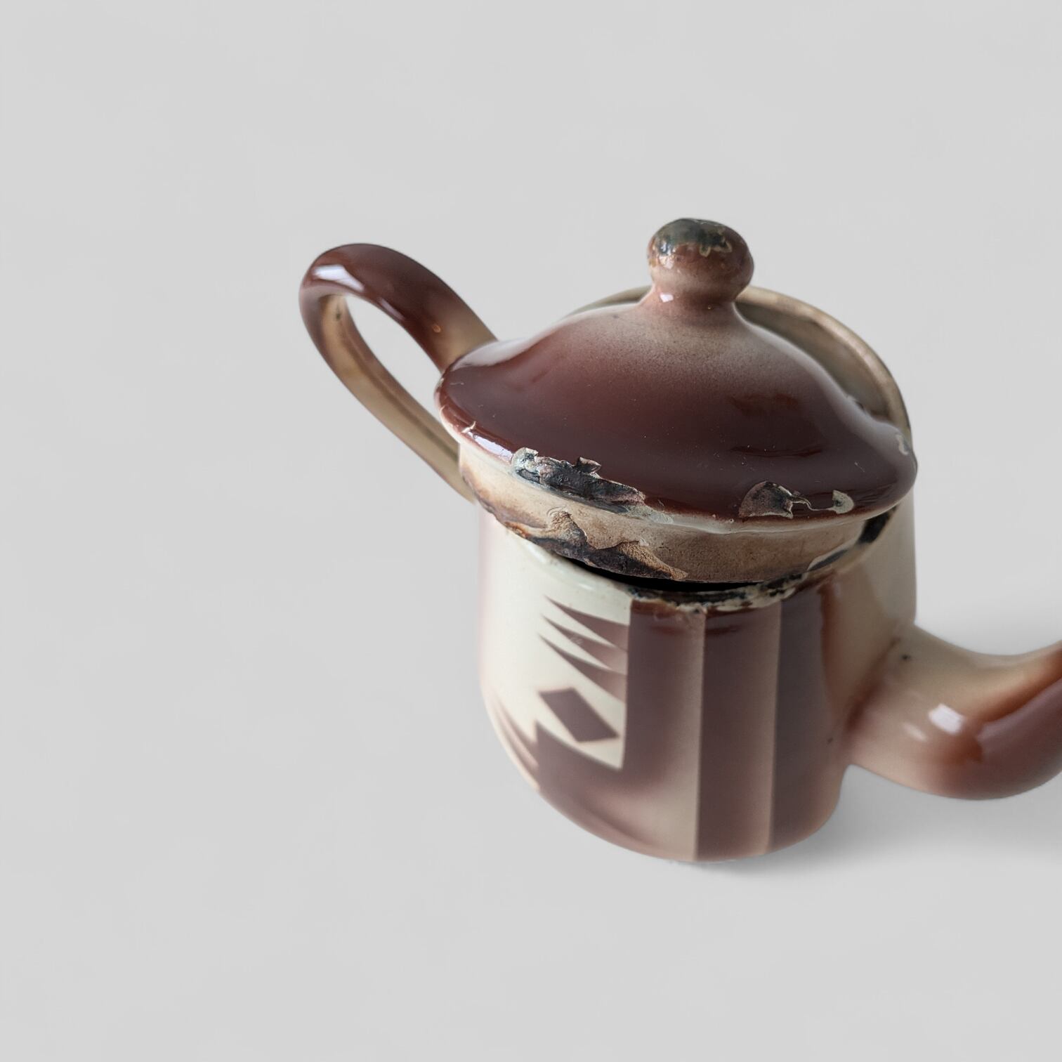 茶色+クリーム色の幾何学模様。柄は、釉薬を吹き付けて加工しているため、境目がぼやけたアンティークにしかない味わいがあります。
