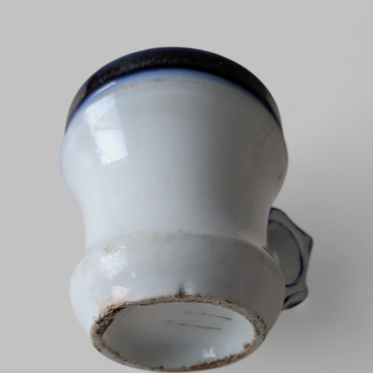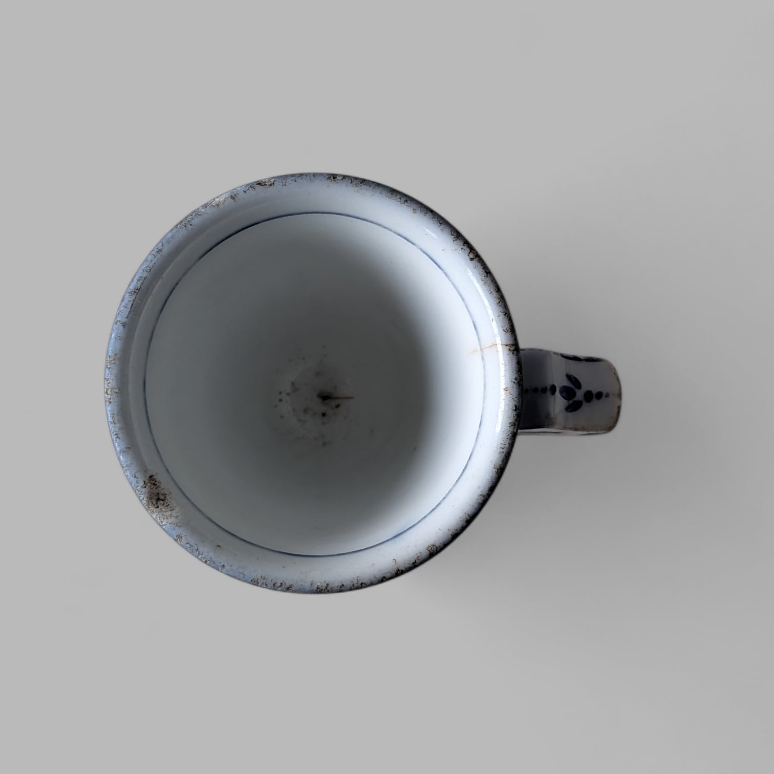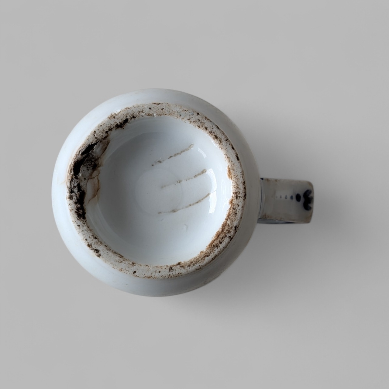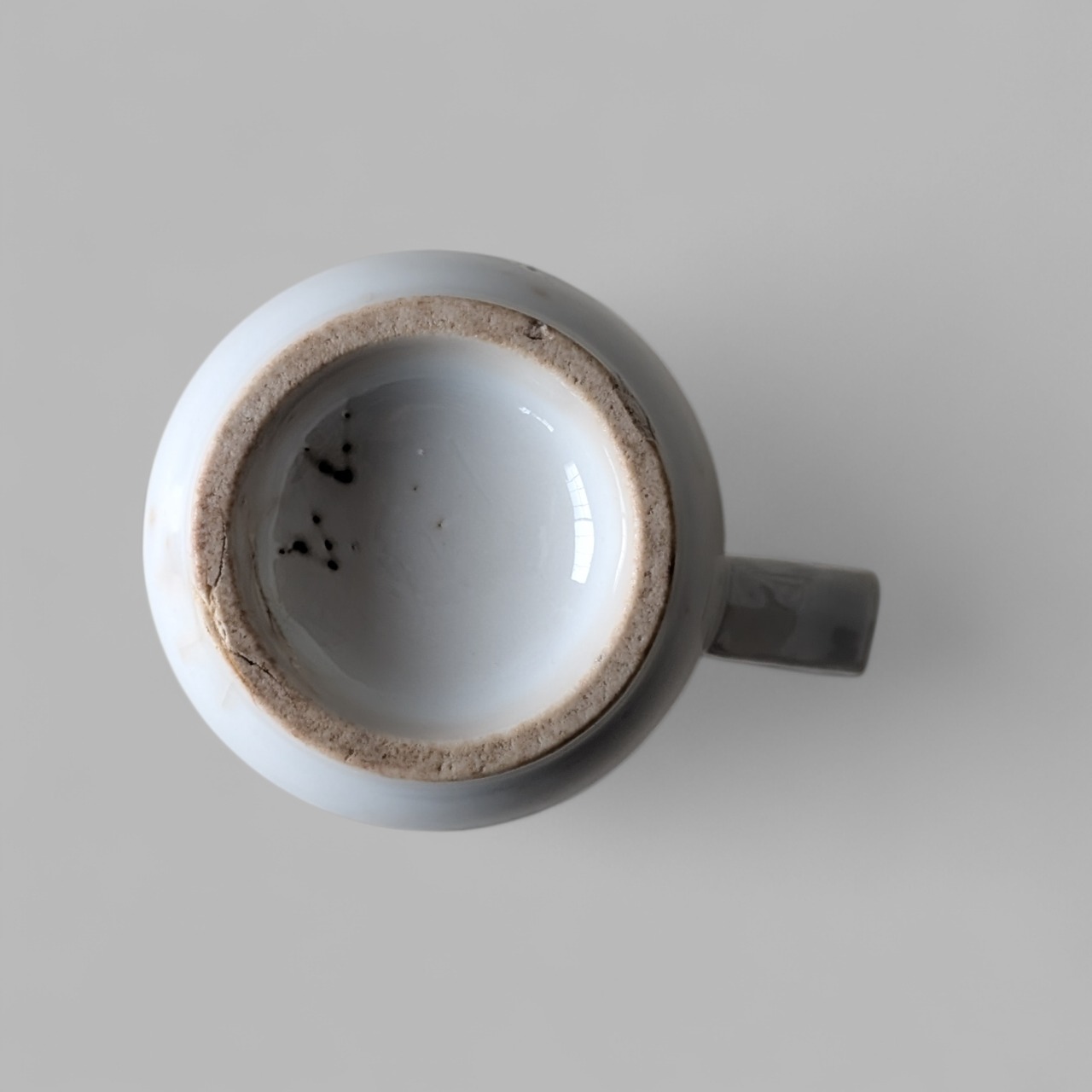 下部高台の縁に製陶時からの欠けと使用による欠け、内側底に貫入、ハンドルにチップ、目跡など有。