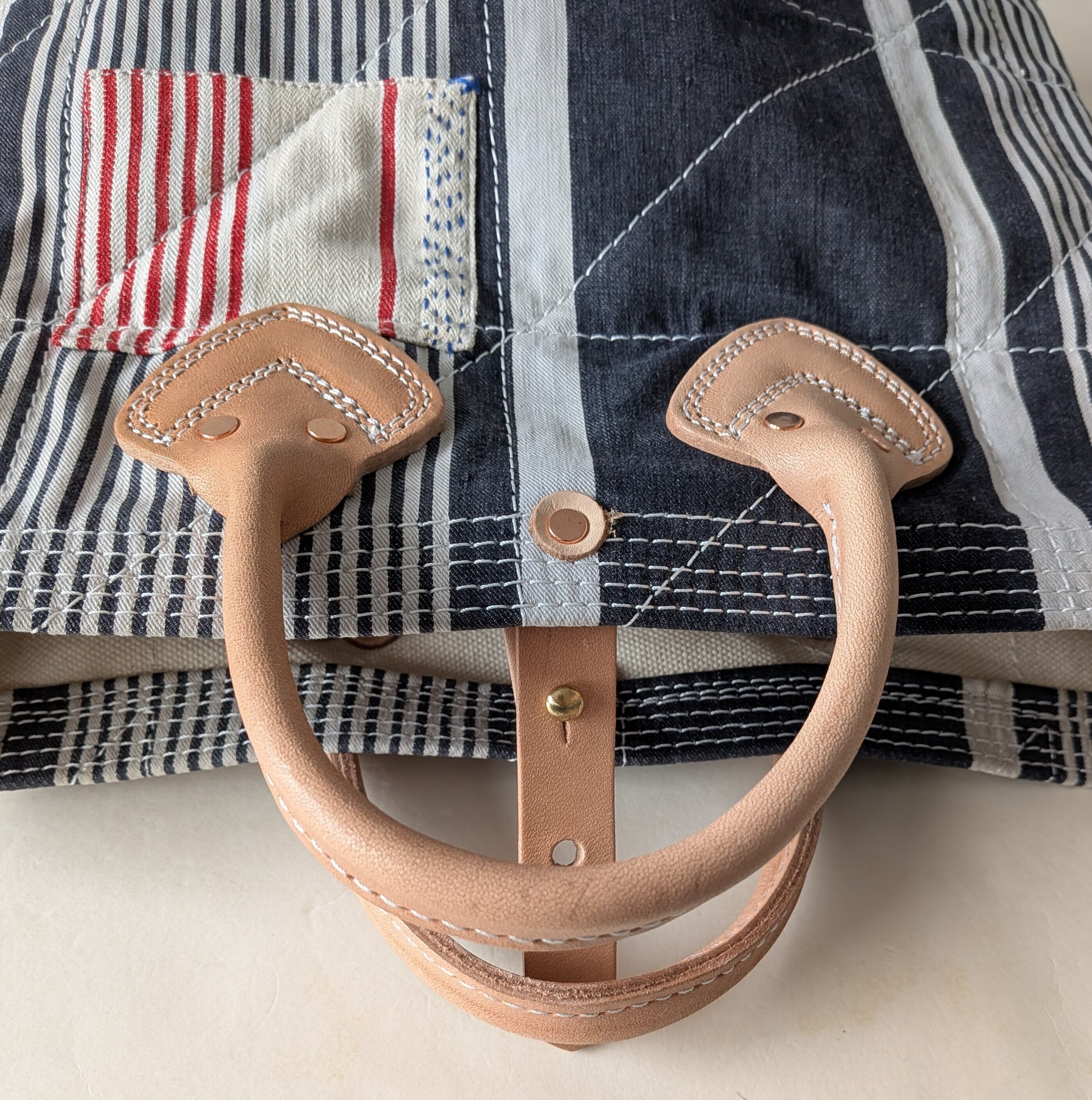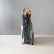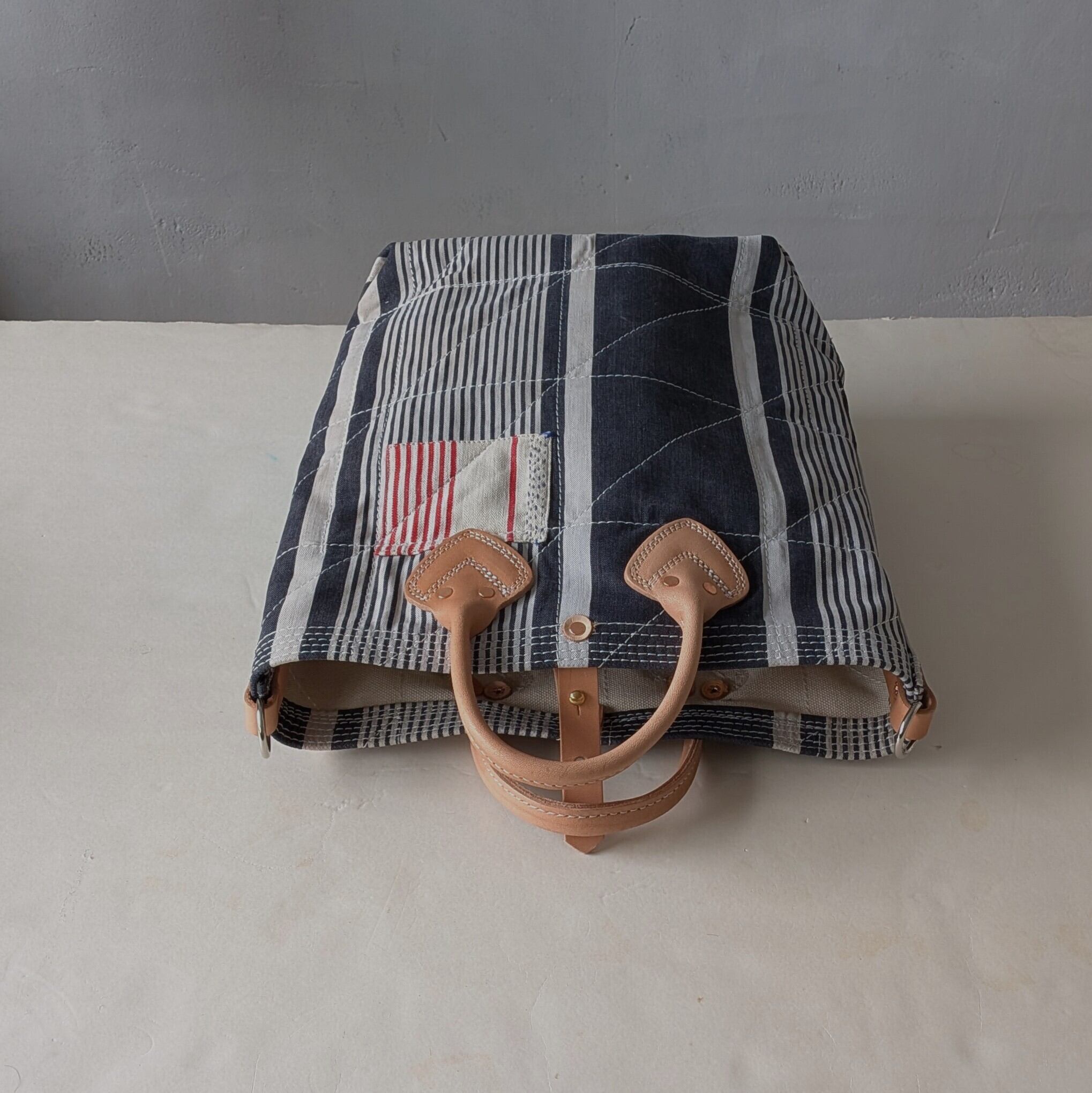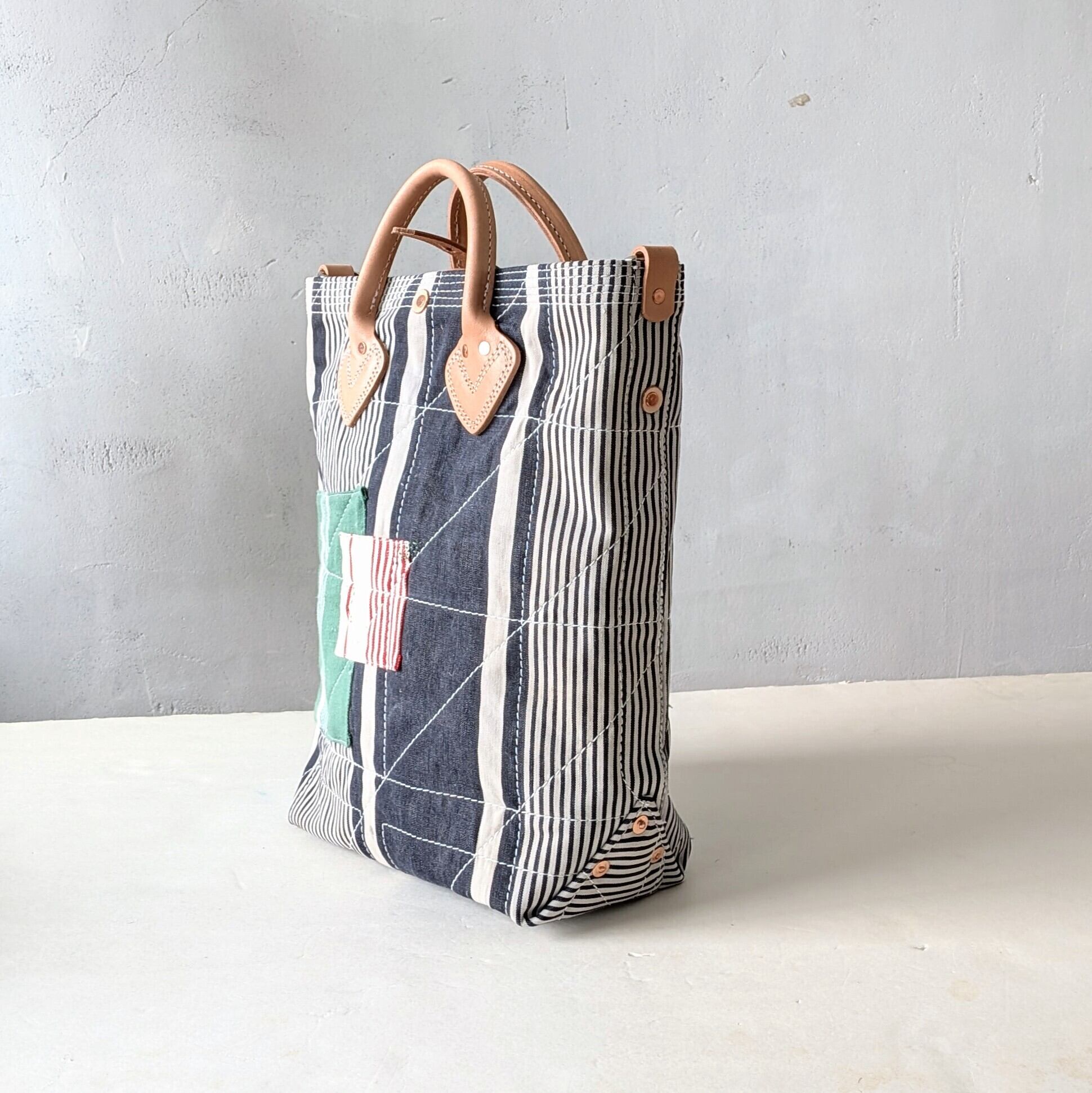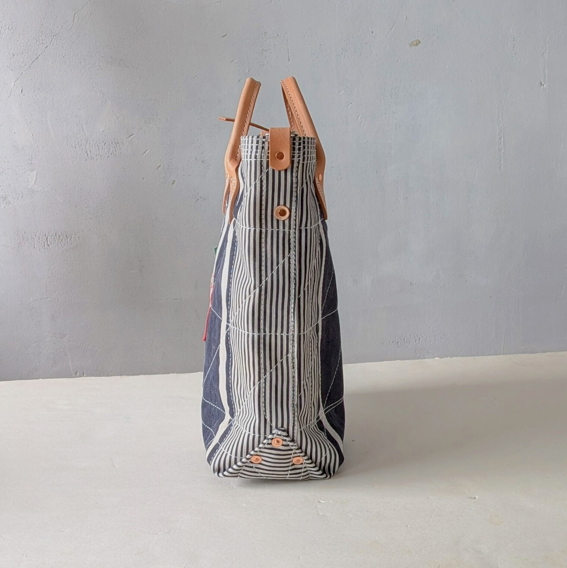 フランスで買付けたアンティークのTICKING FABRICを4号帆布に貼り付けて作ったトートバッグ。