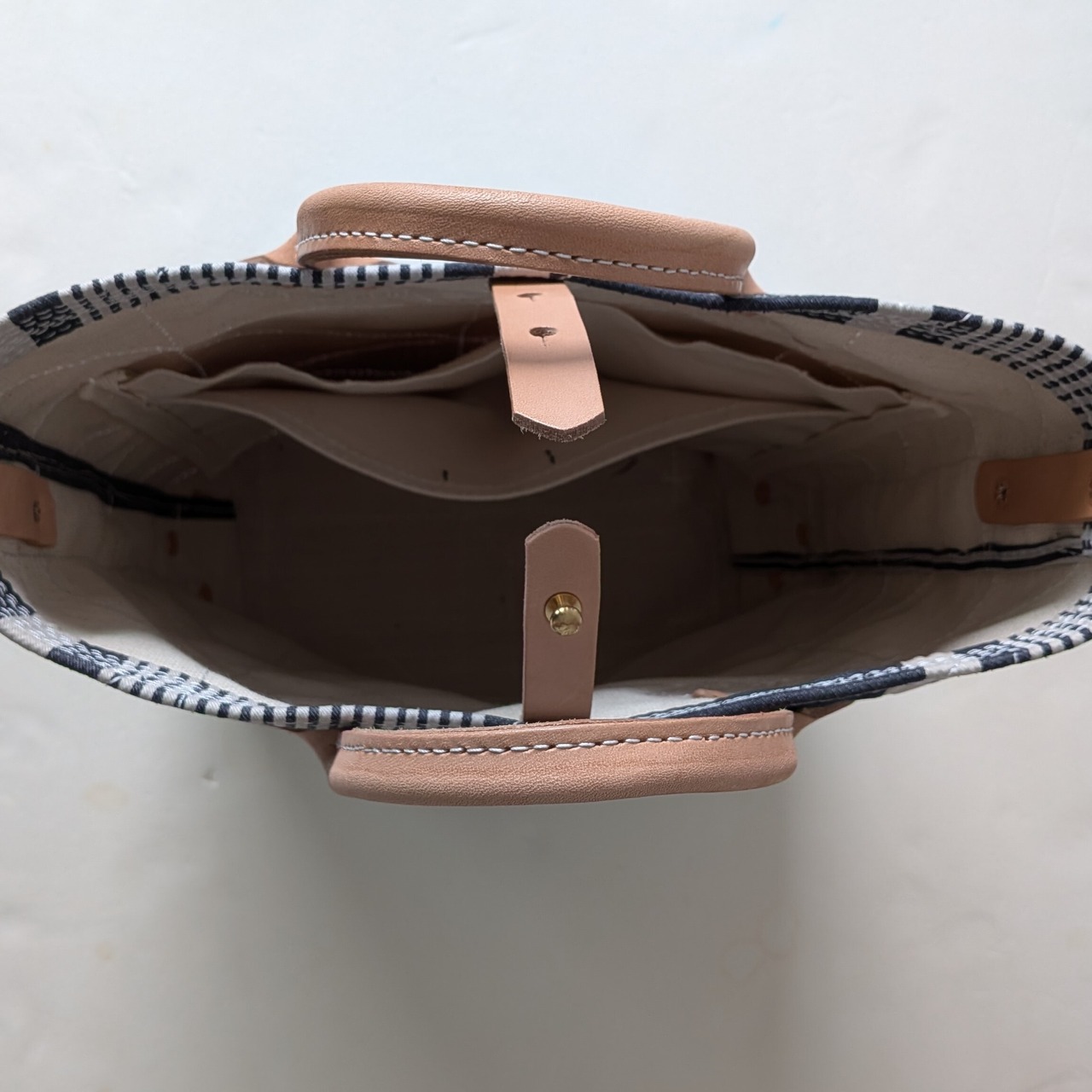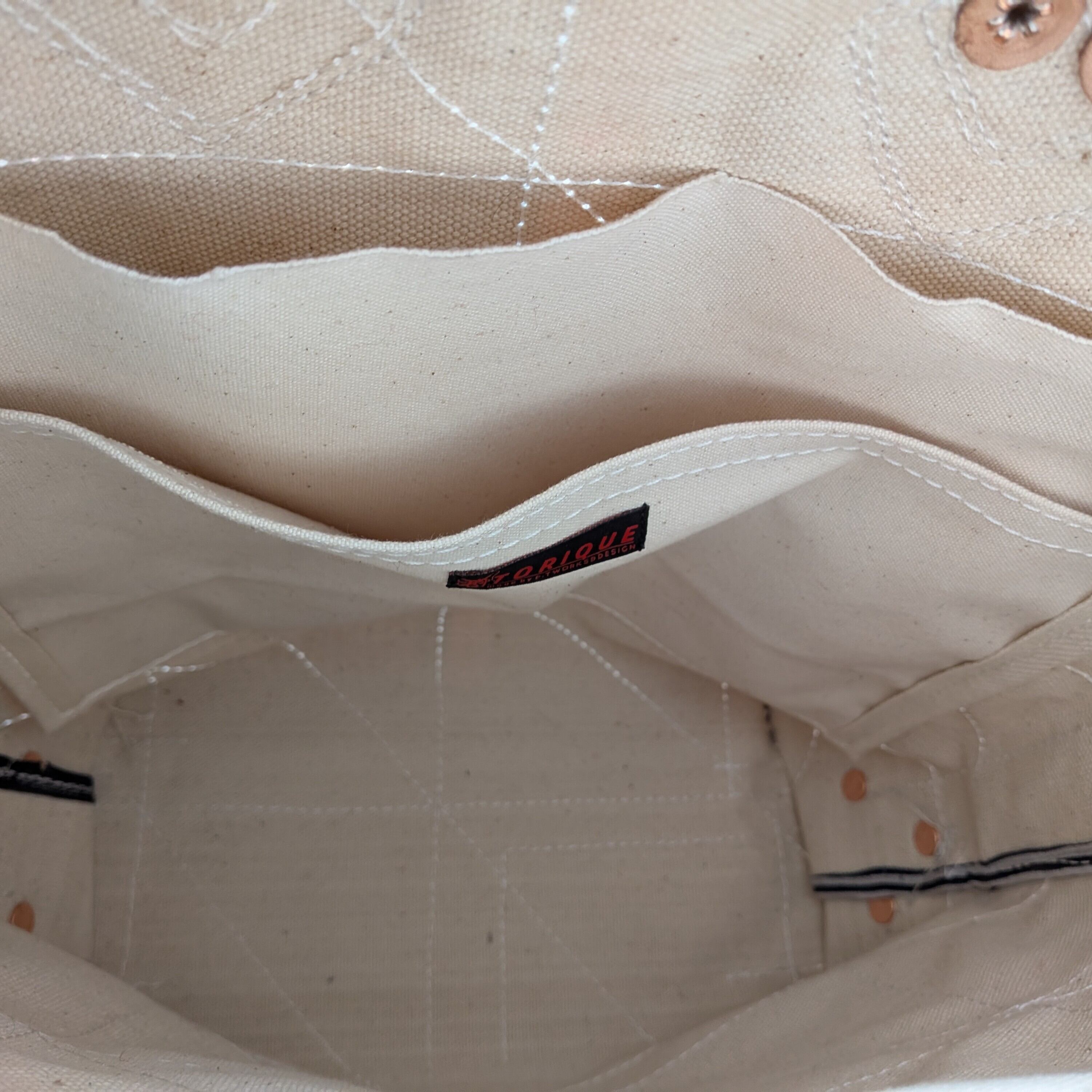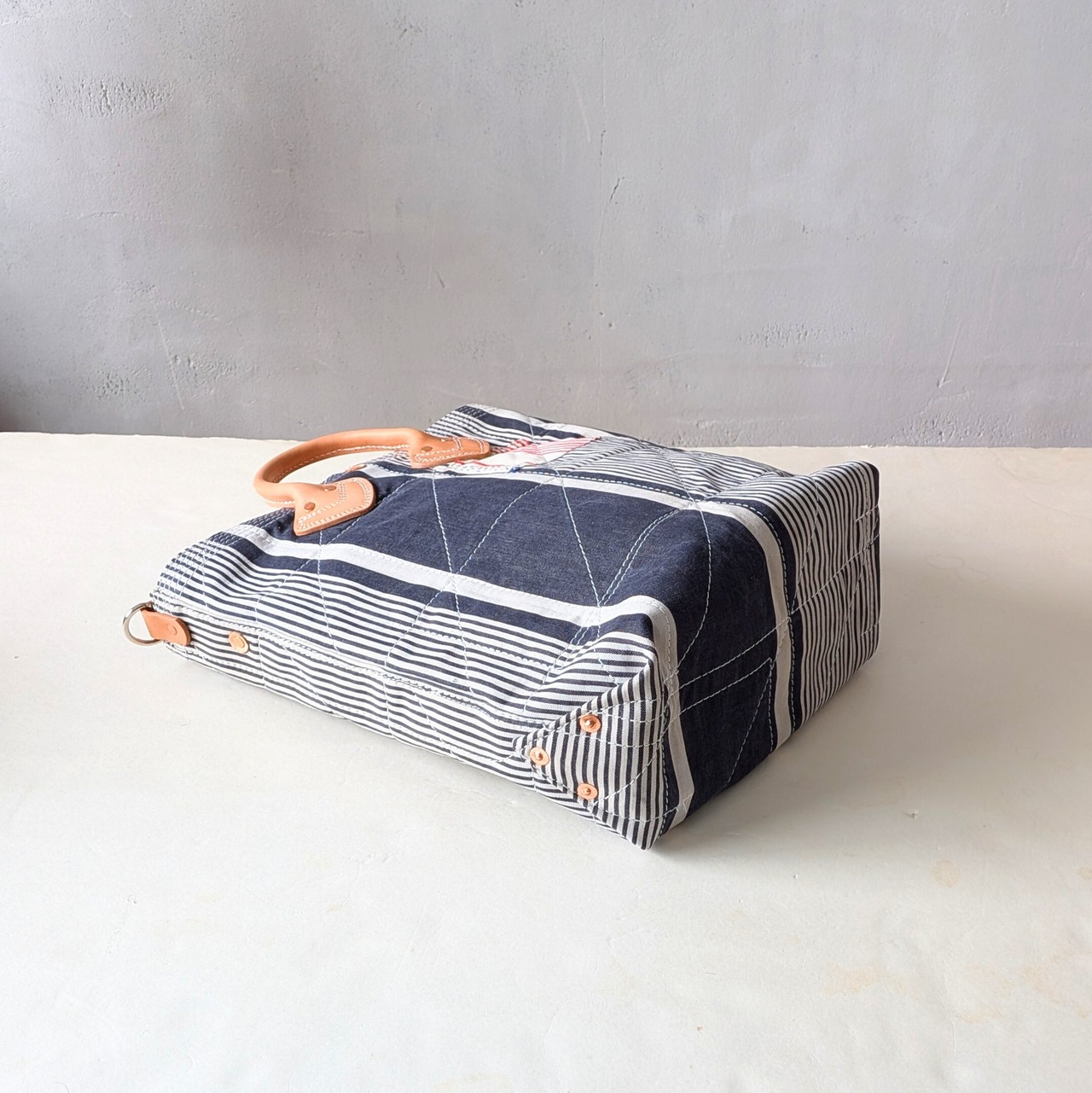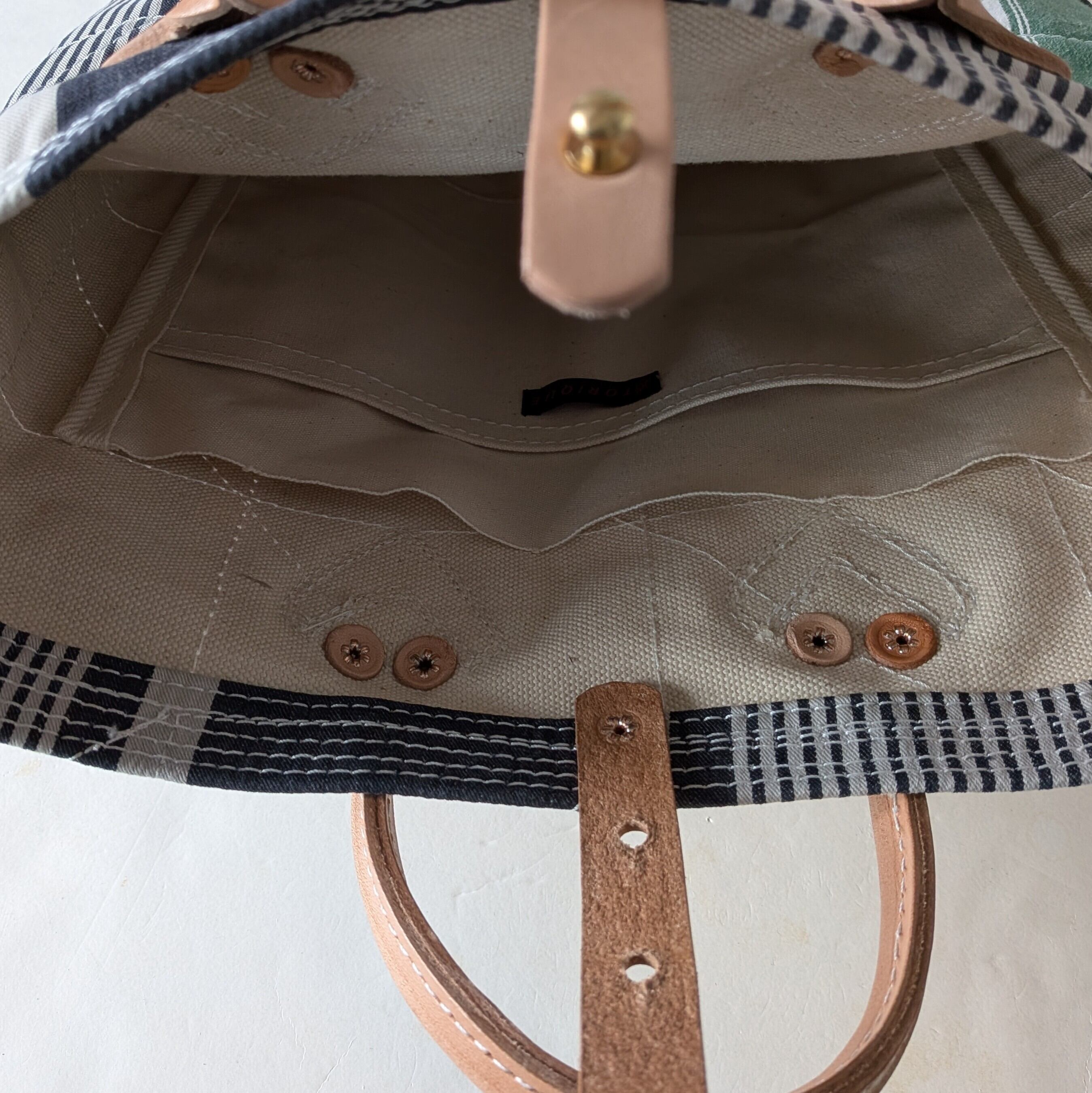 フランスで買付けたアンティークのTICKING FABRICを4号帆布に貼り付けて作ったトートバッグ。