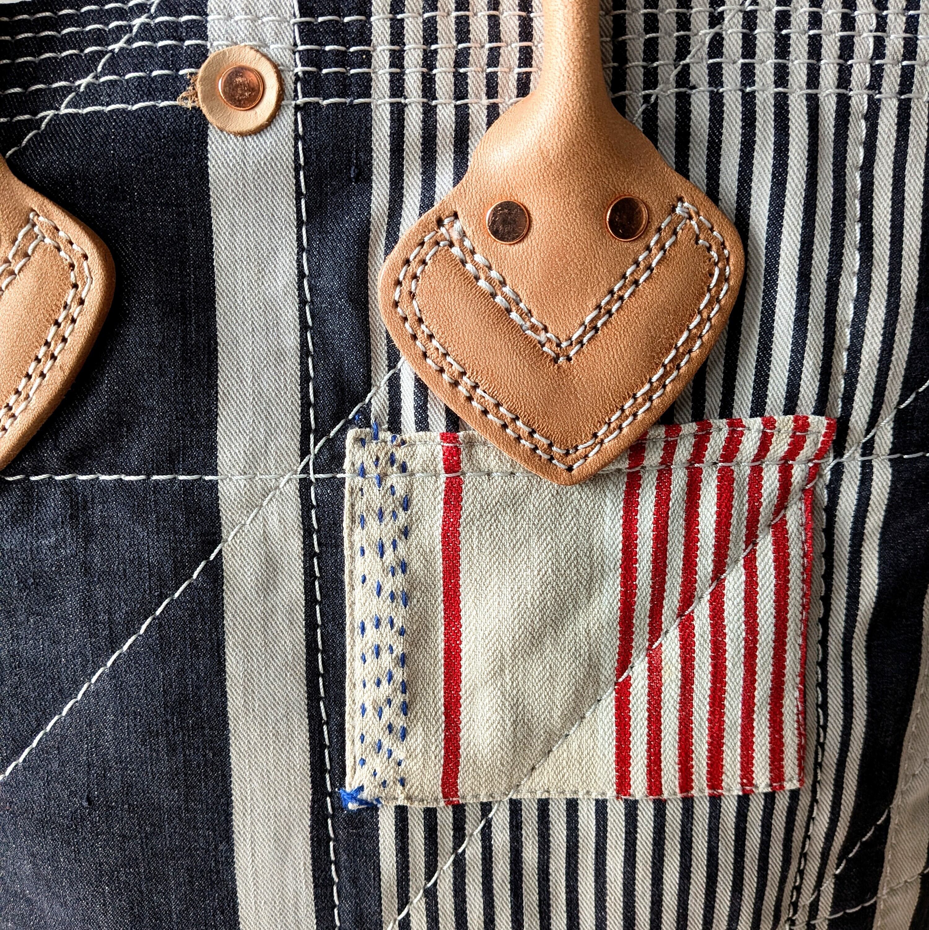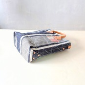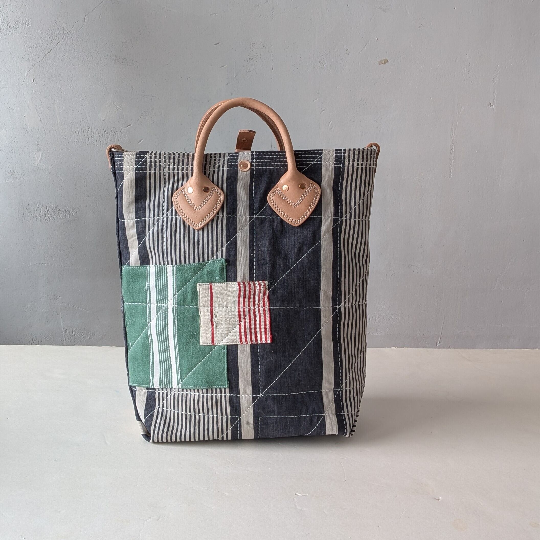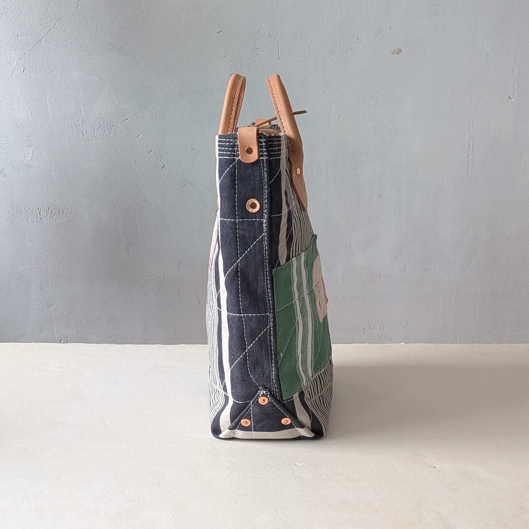 全体に太い糸でミシンステッチをかけ、生地の薄くなっている場所にはパッチワークやダーニングでリペアをし、どの方向から見ても、まるでアートのような1点です。縦長タイプ。