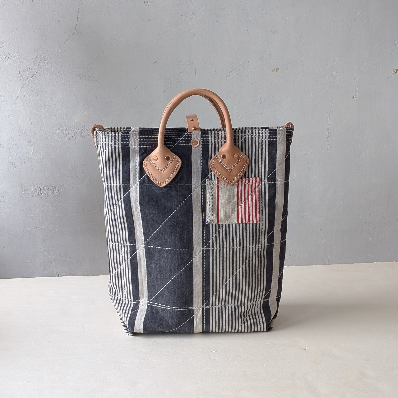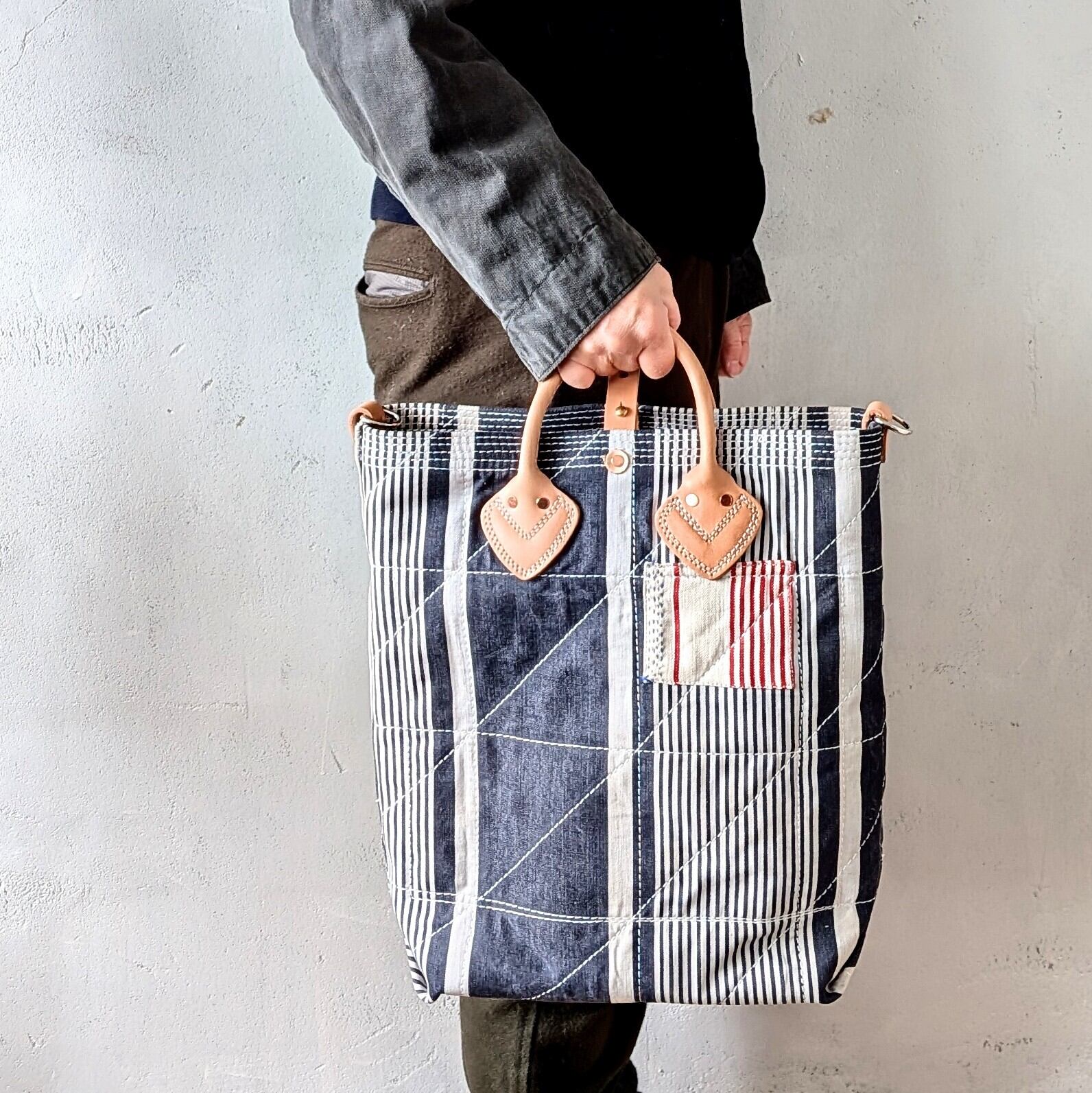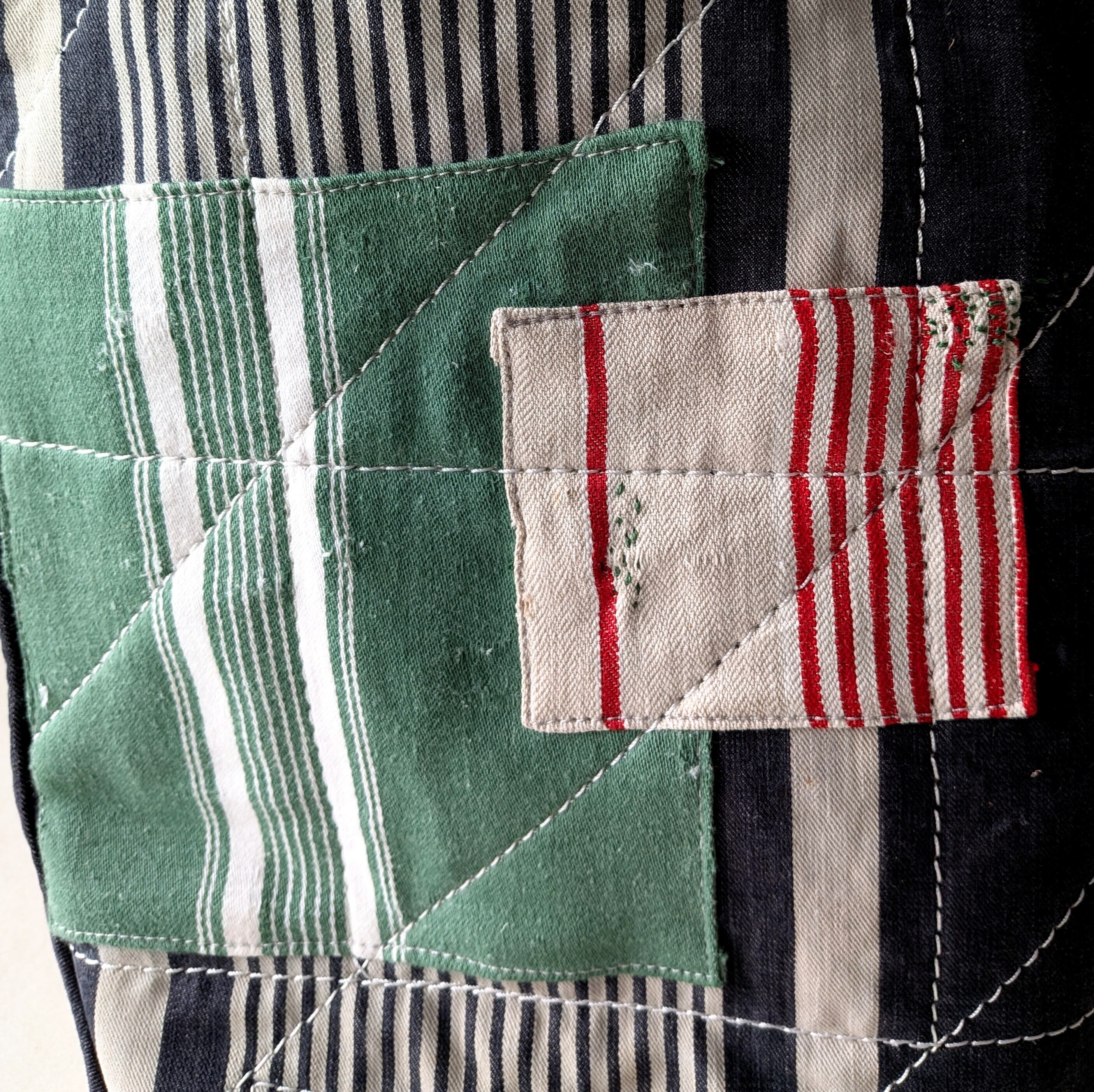全体に太い糸でミシンステッチをかけ、生地の薄くなっている場所にはパッチワークやダーニングでリペアをし、どの方向から見ても、まるでアートのような1点です。縦長タイプ。
