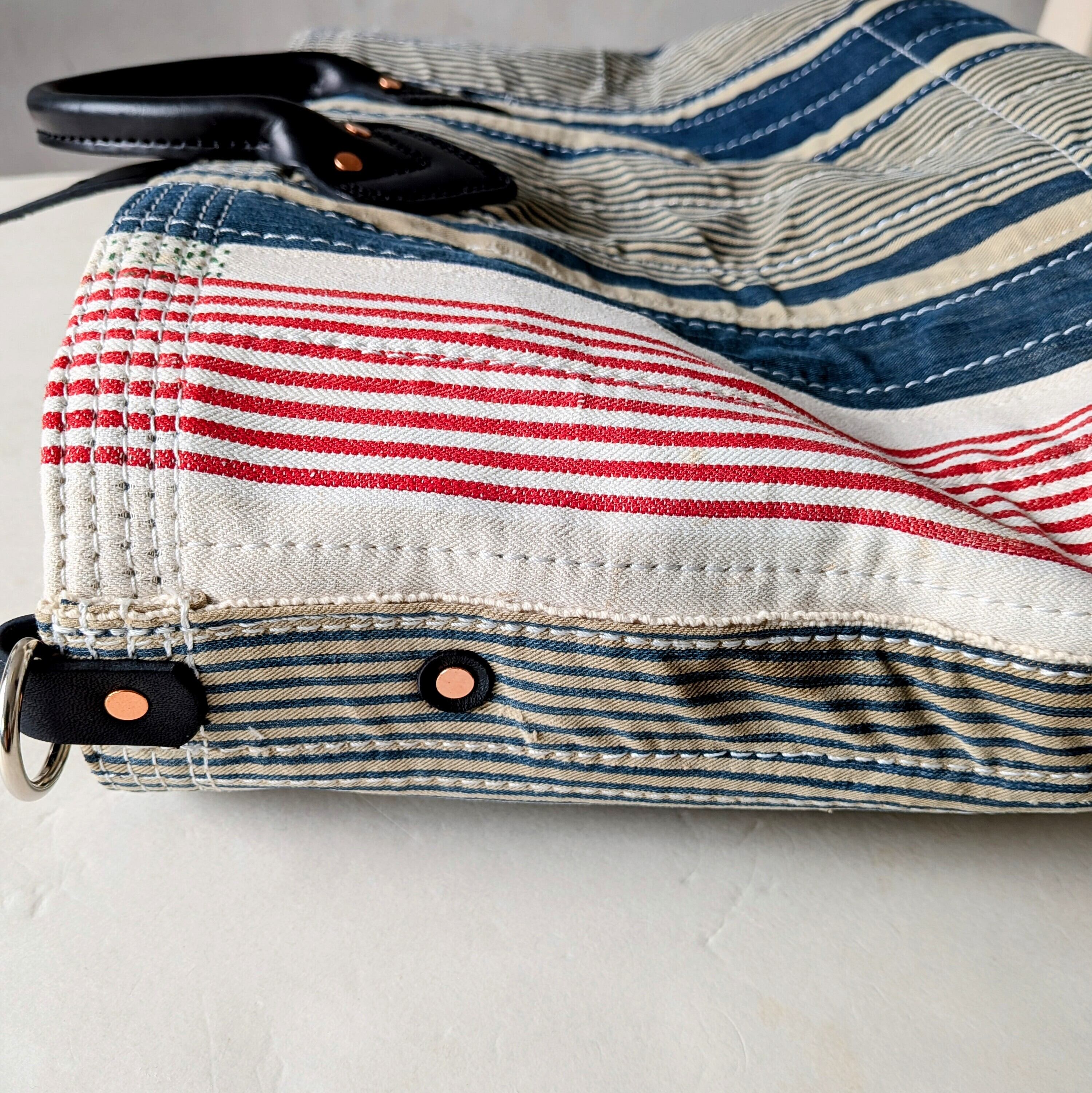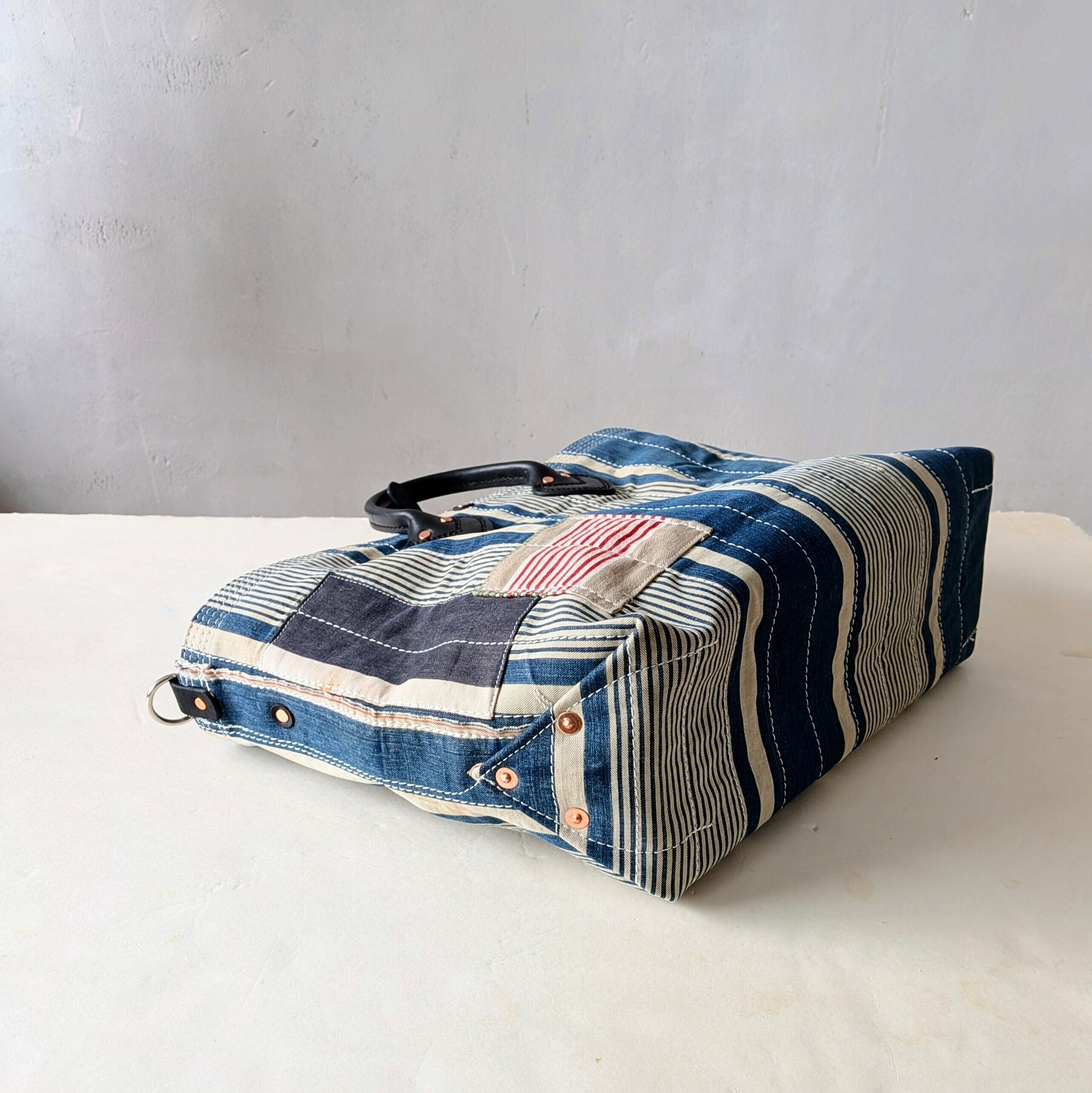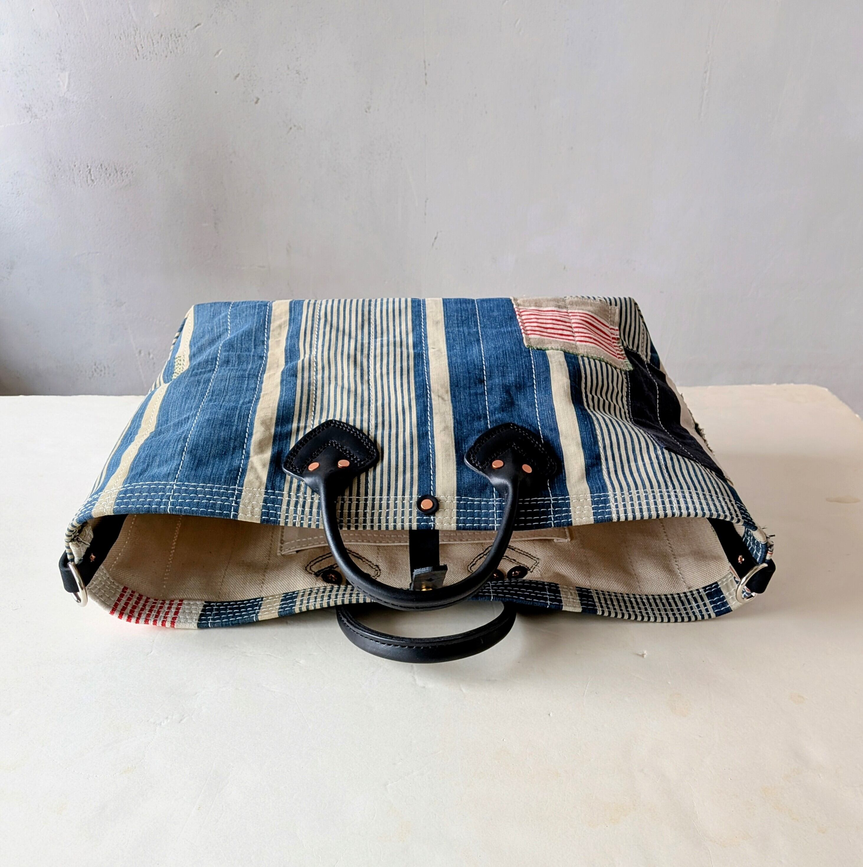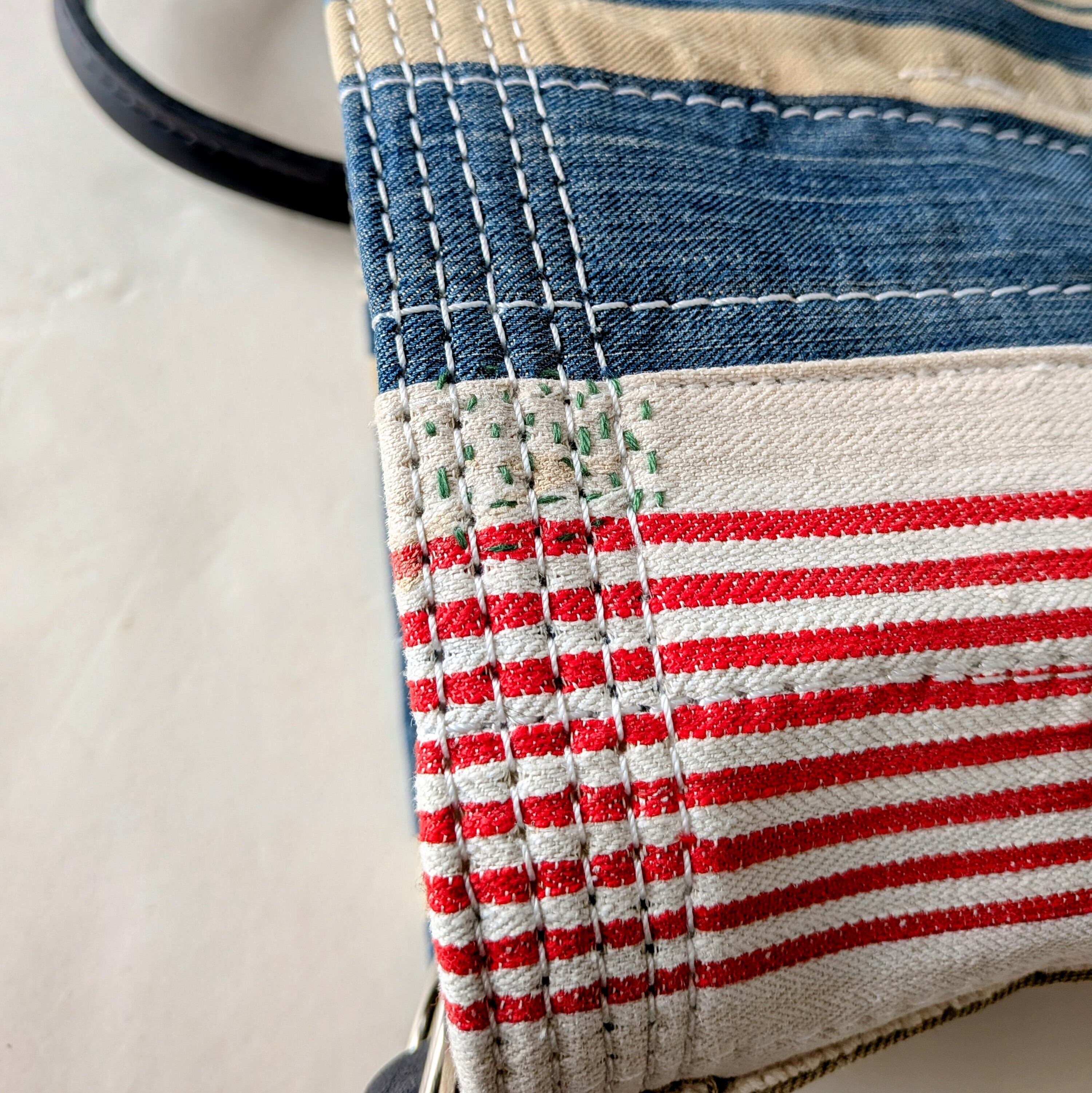 全体に太い糸でミシンステッチをかけ、生地の薄くなっている場所にはパッチワークやダーニングでリペアをし、どの方向から見ても、まるでアートのような1点です。横長タイプ。