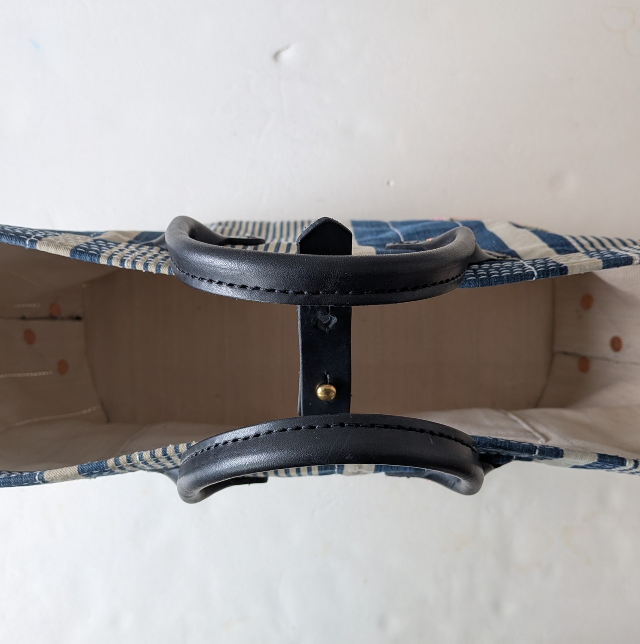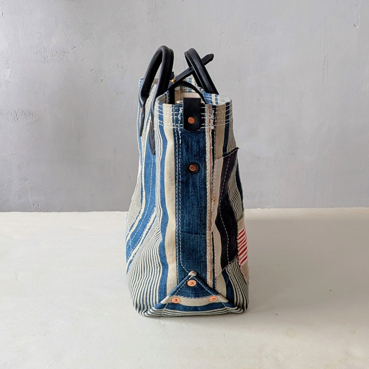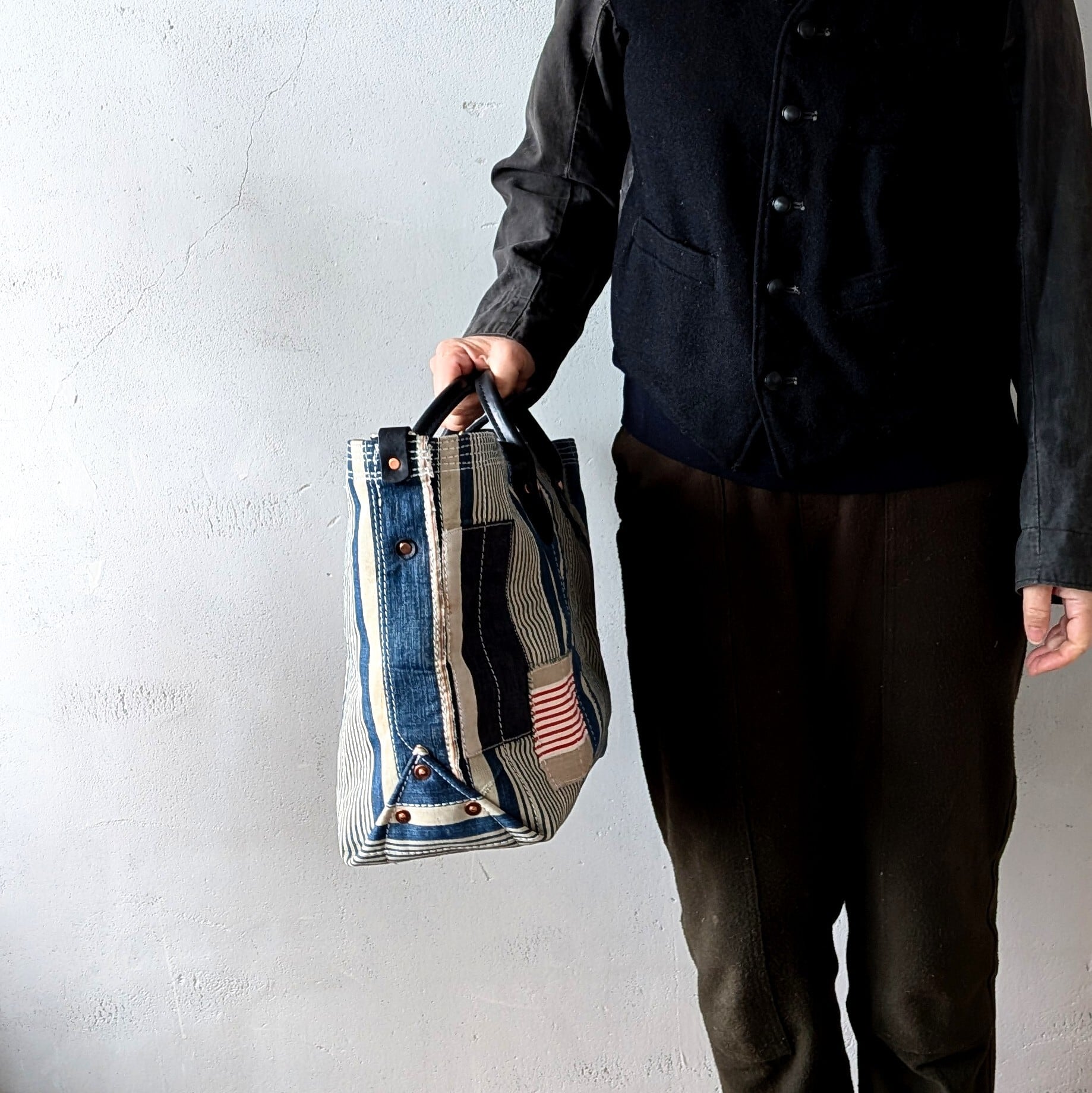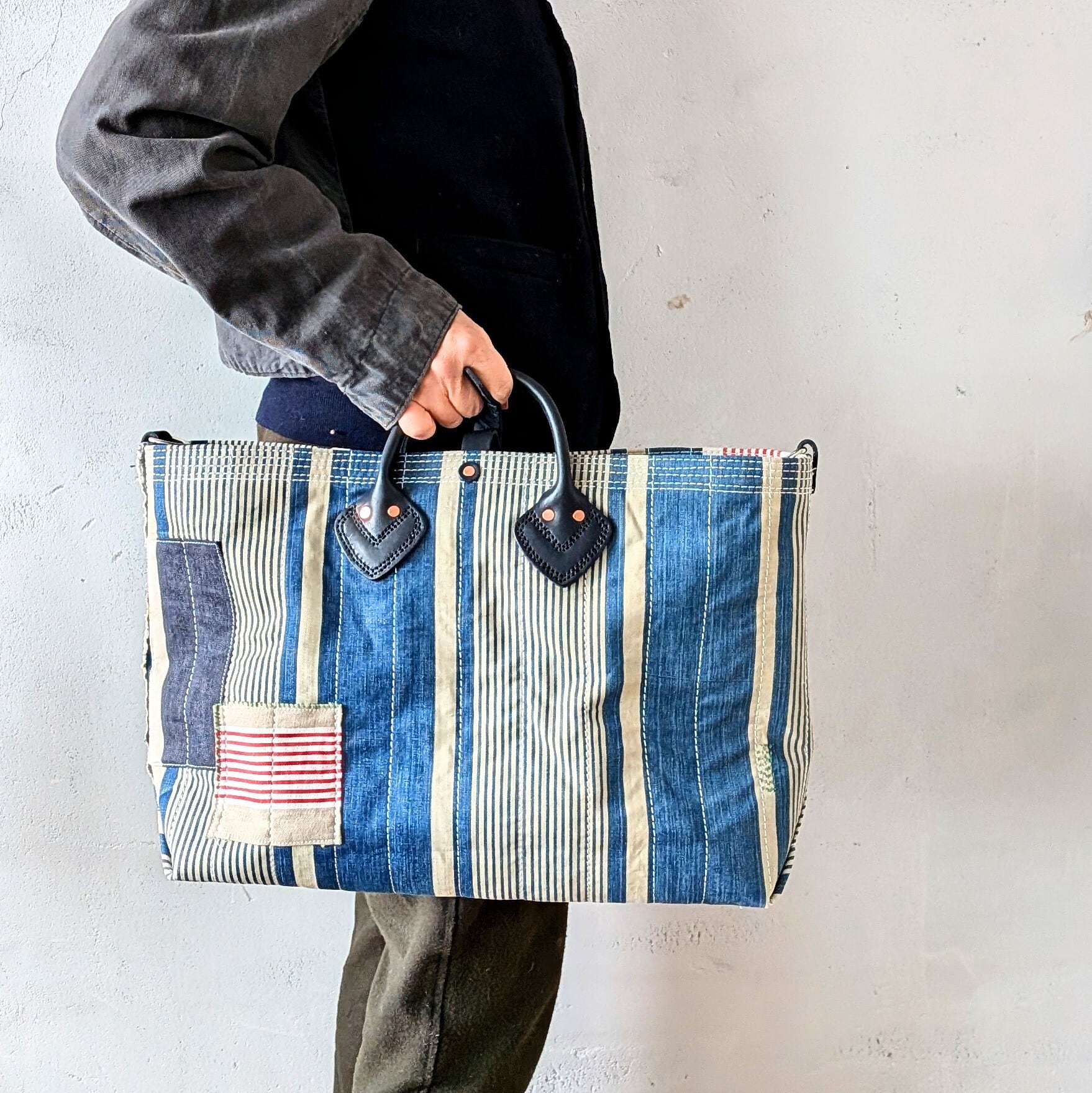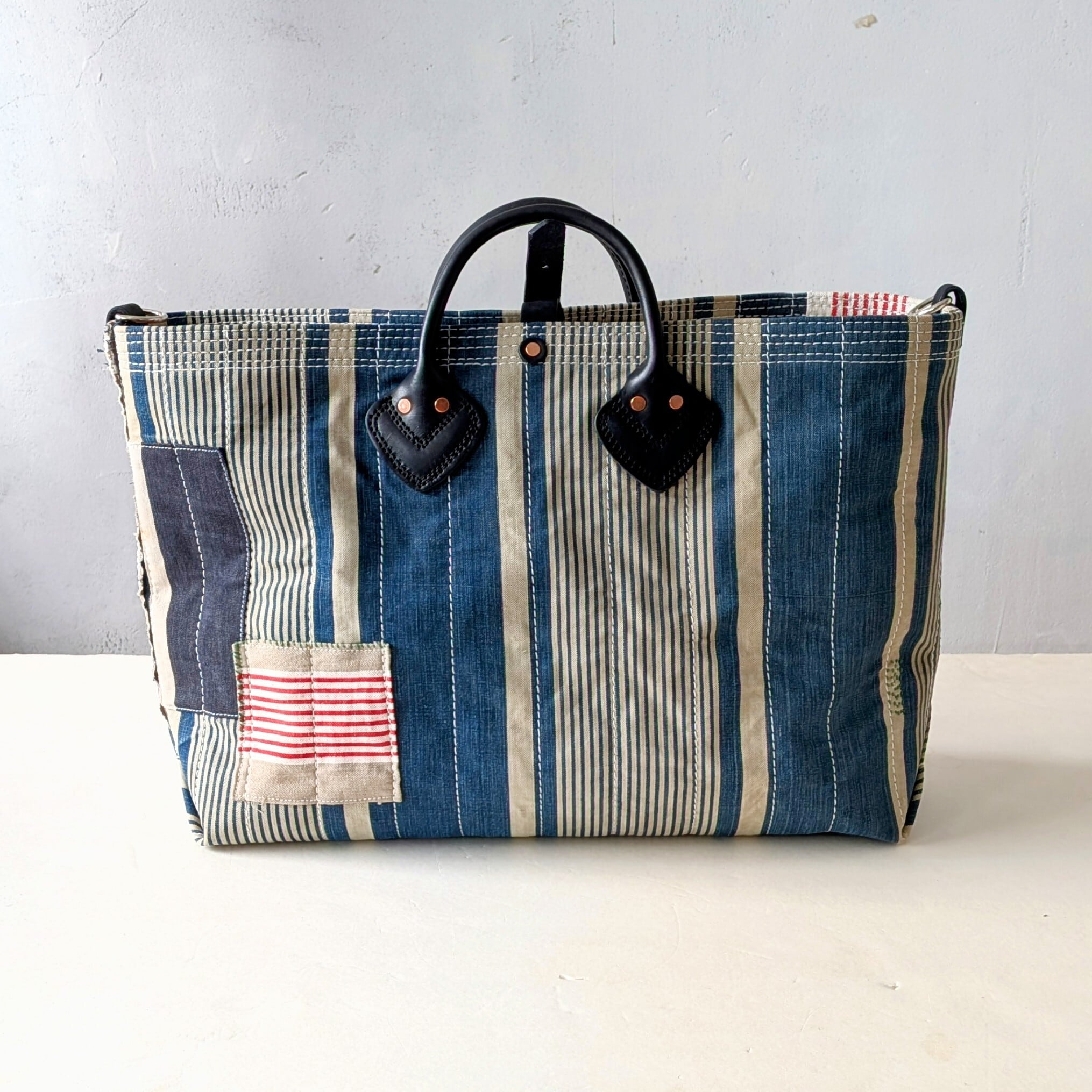 全体に太い糸でミシンステッチをかけ、生地の薄くなっている場所にはパッチワークやダーニングでリペアをし、どの方向から見ても、まるでアートのような1点です。横長タイプ。