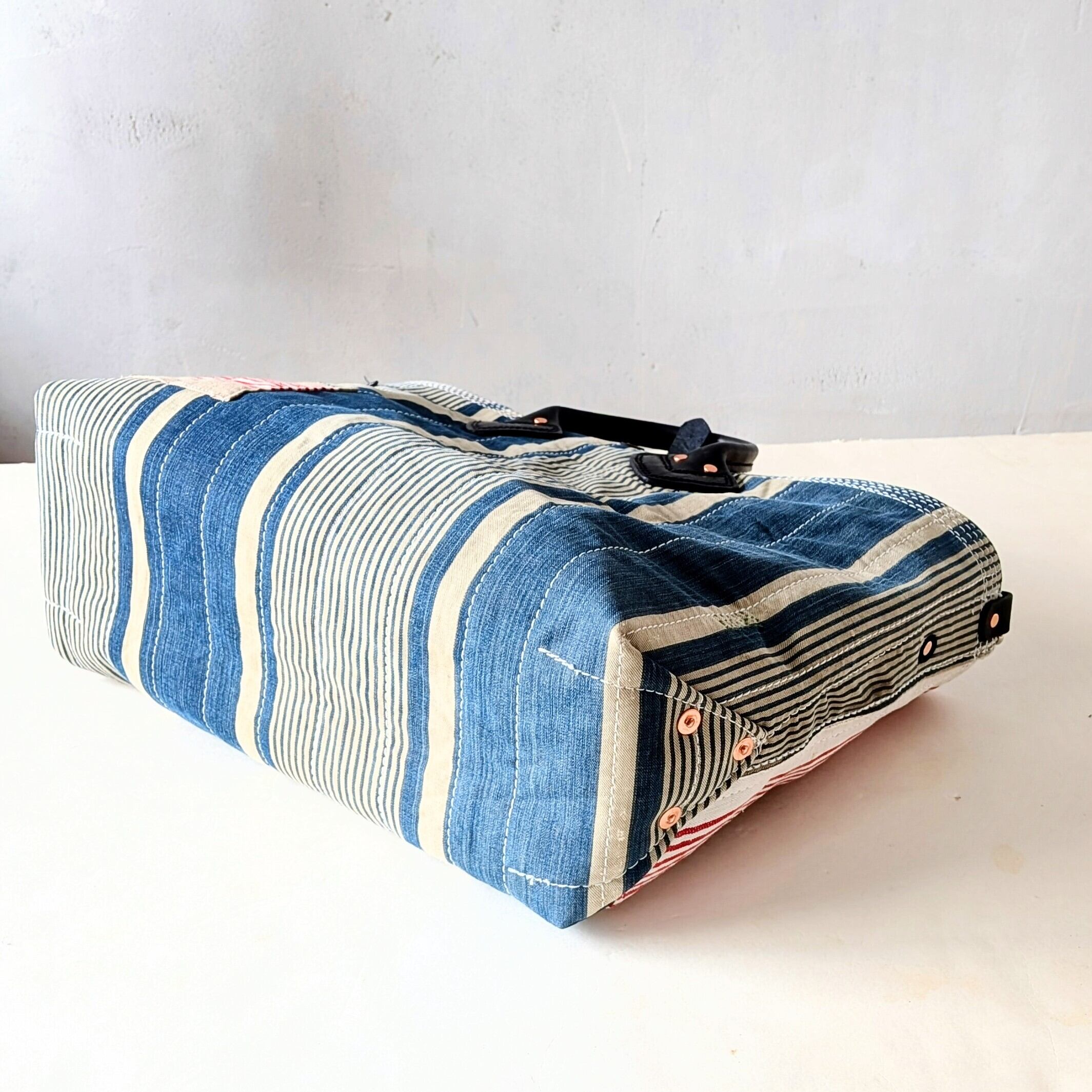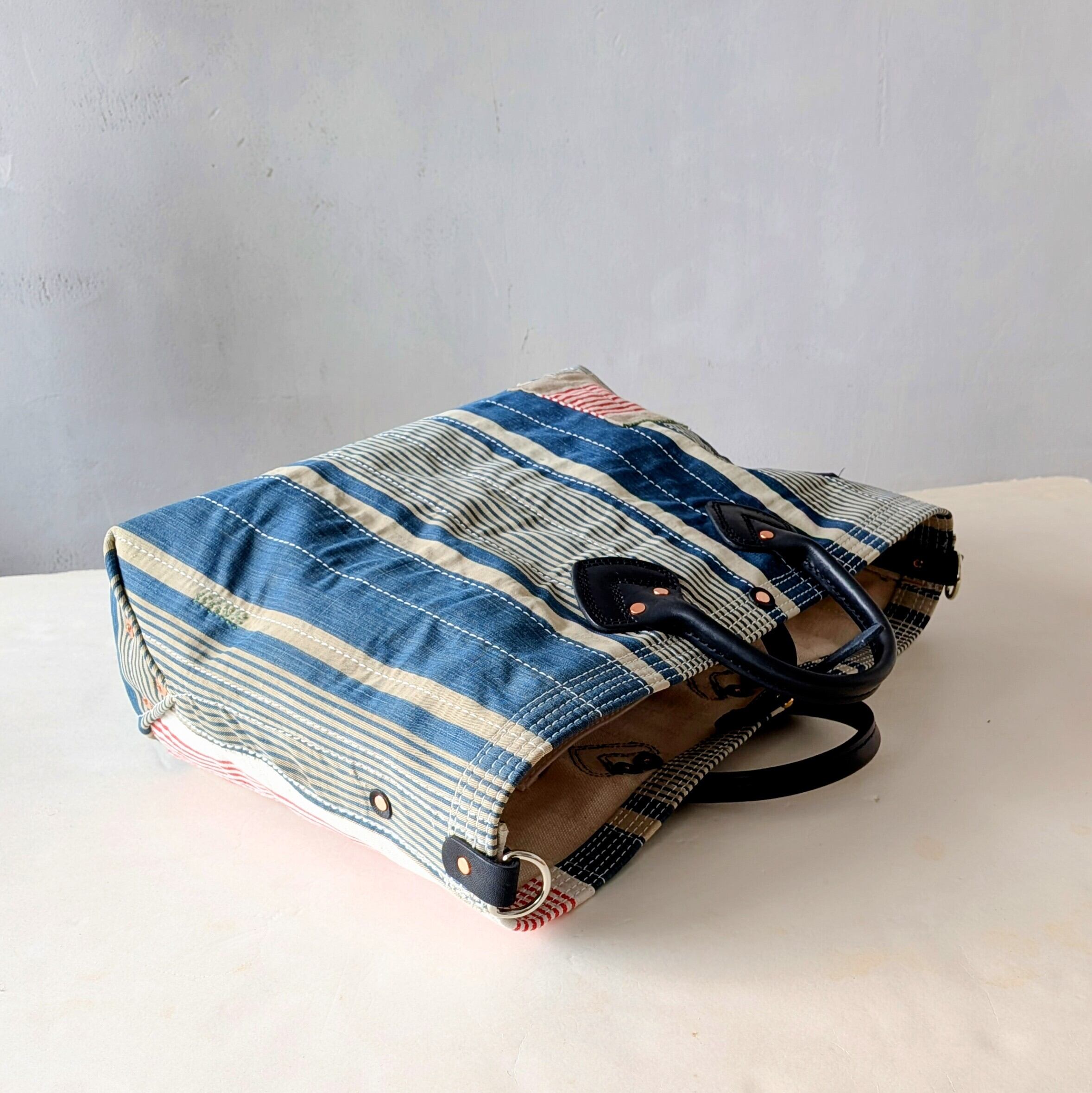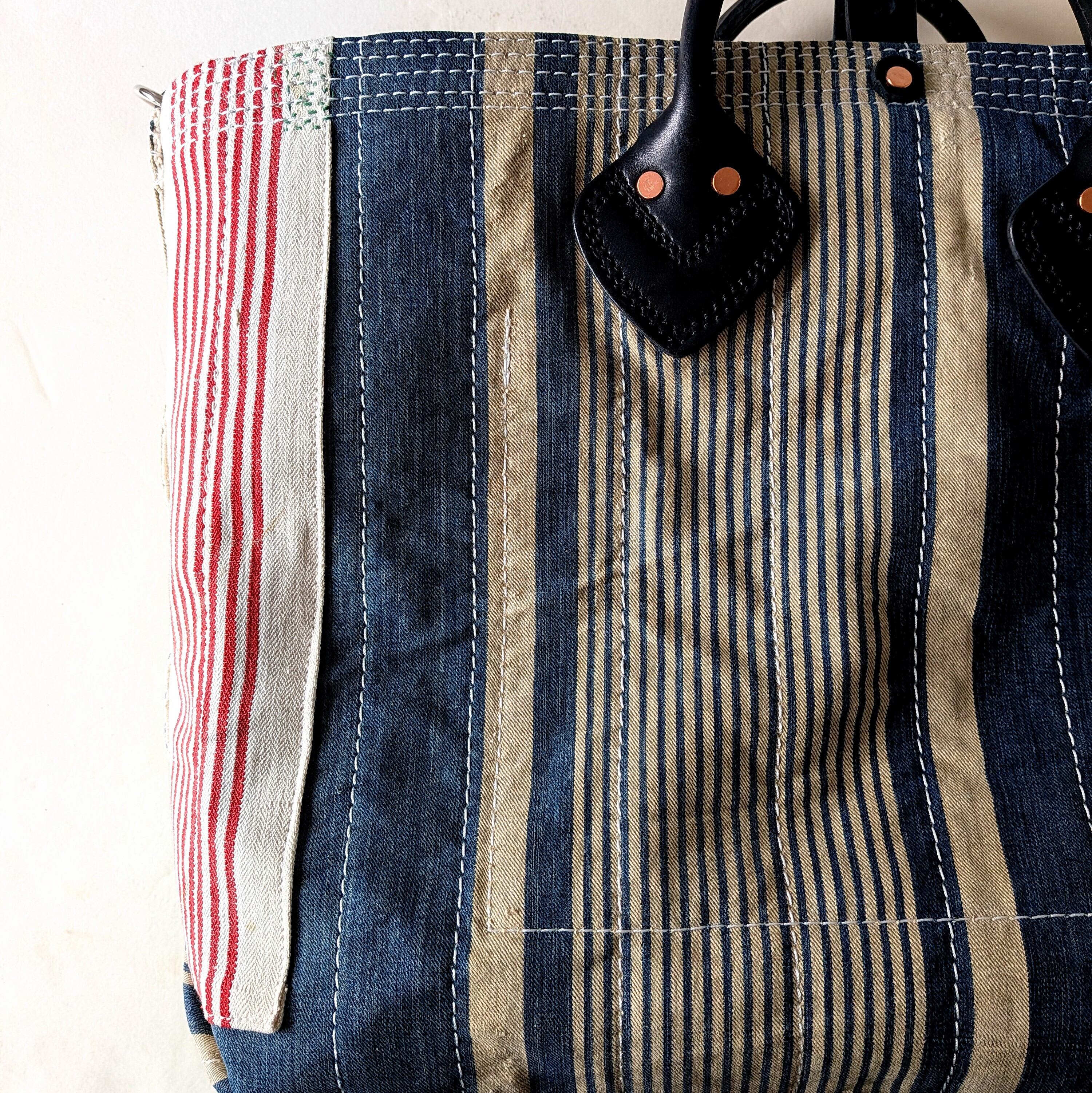 フランスで買付けたアンティークのTICKING FABRICを4号帆布に貼り付けて作ったトートバッグ。