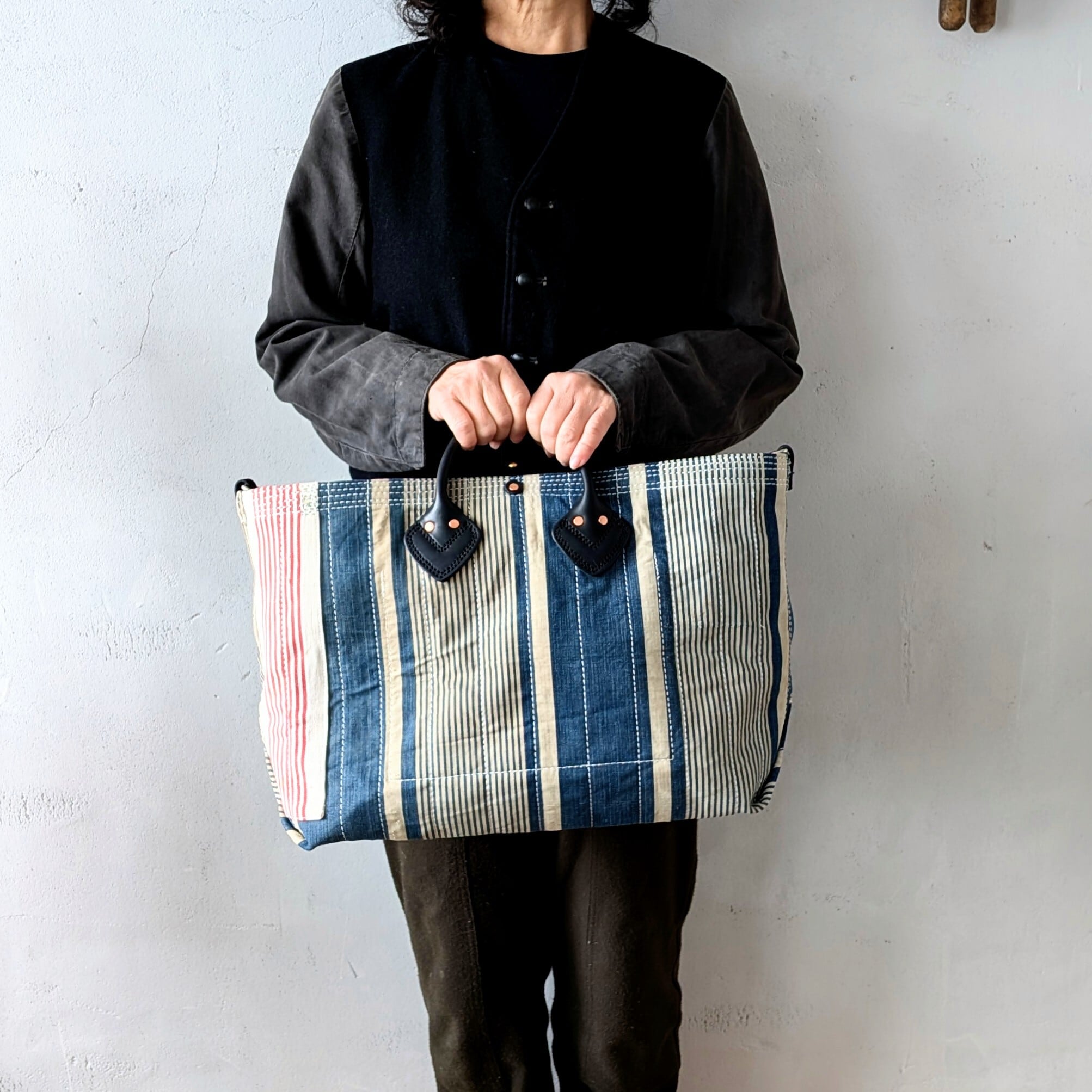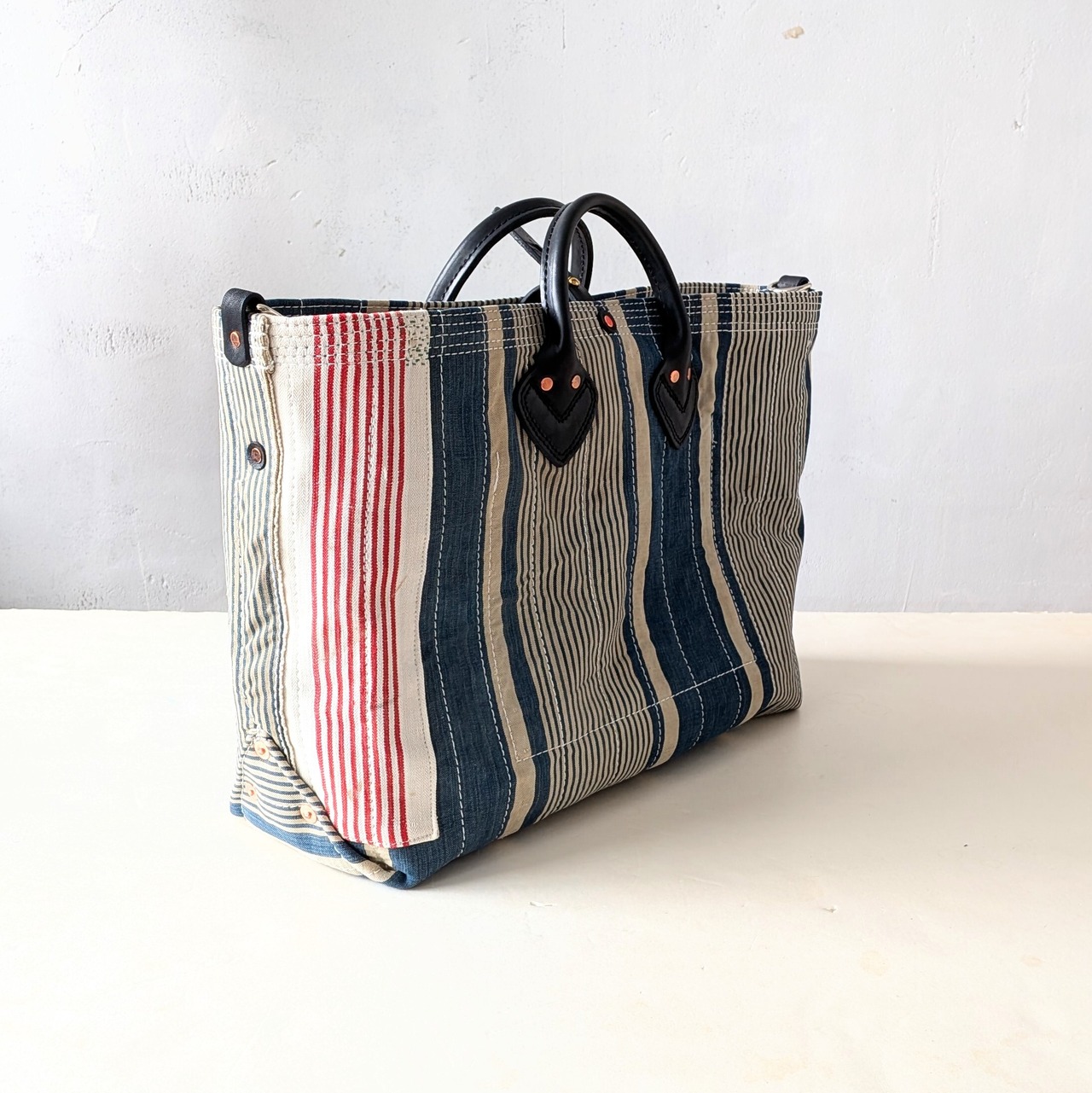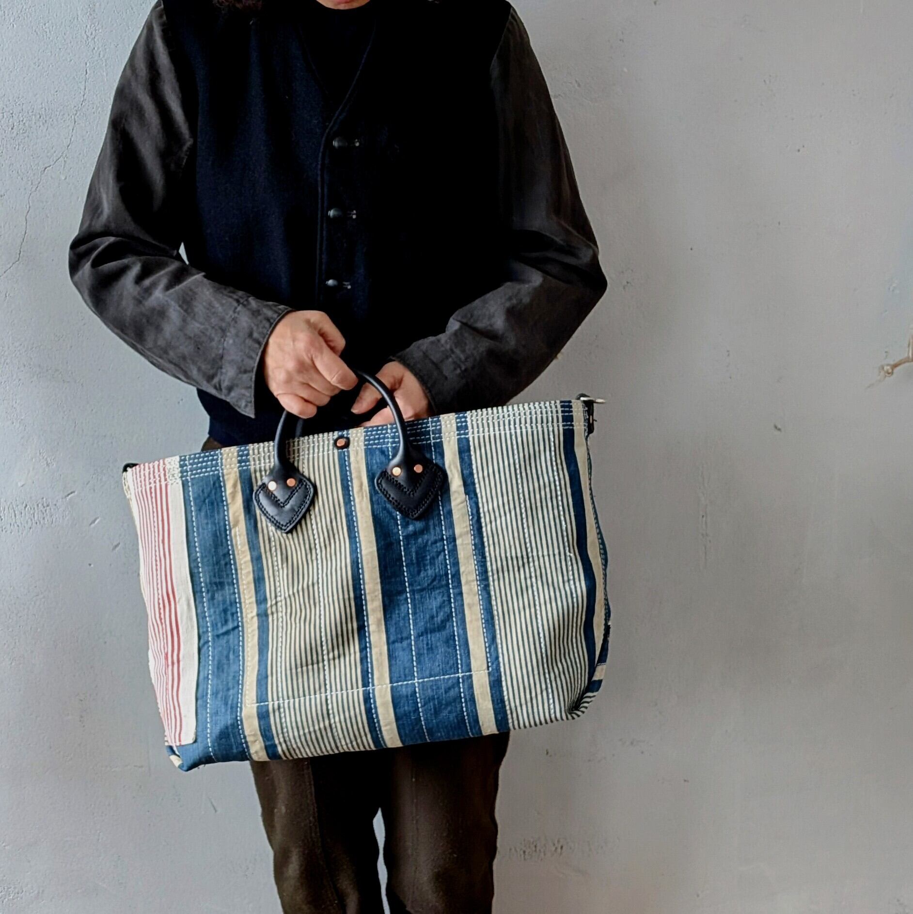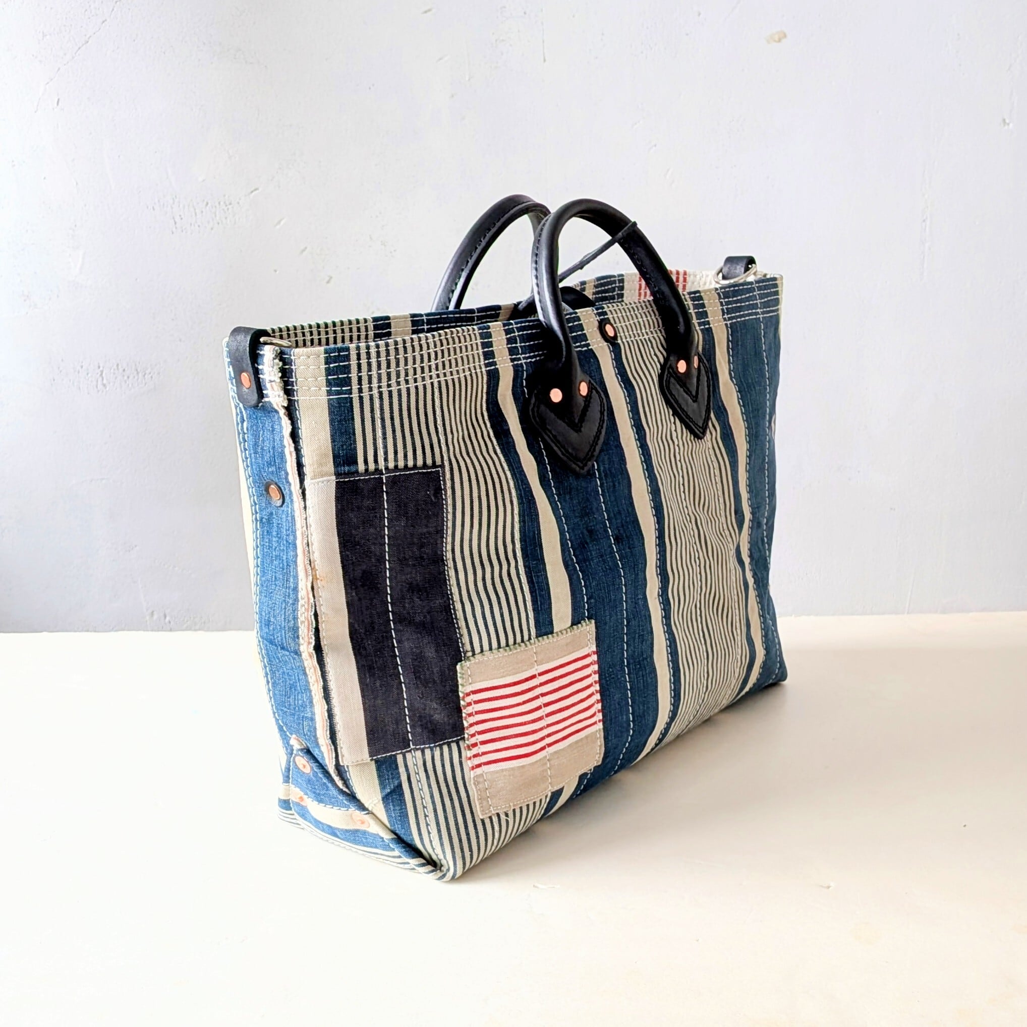 フランスで買付けたアンティークのTICKING FABRICを4号帆布に貼り付けて作ったトートバッグ。