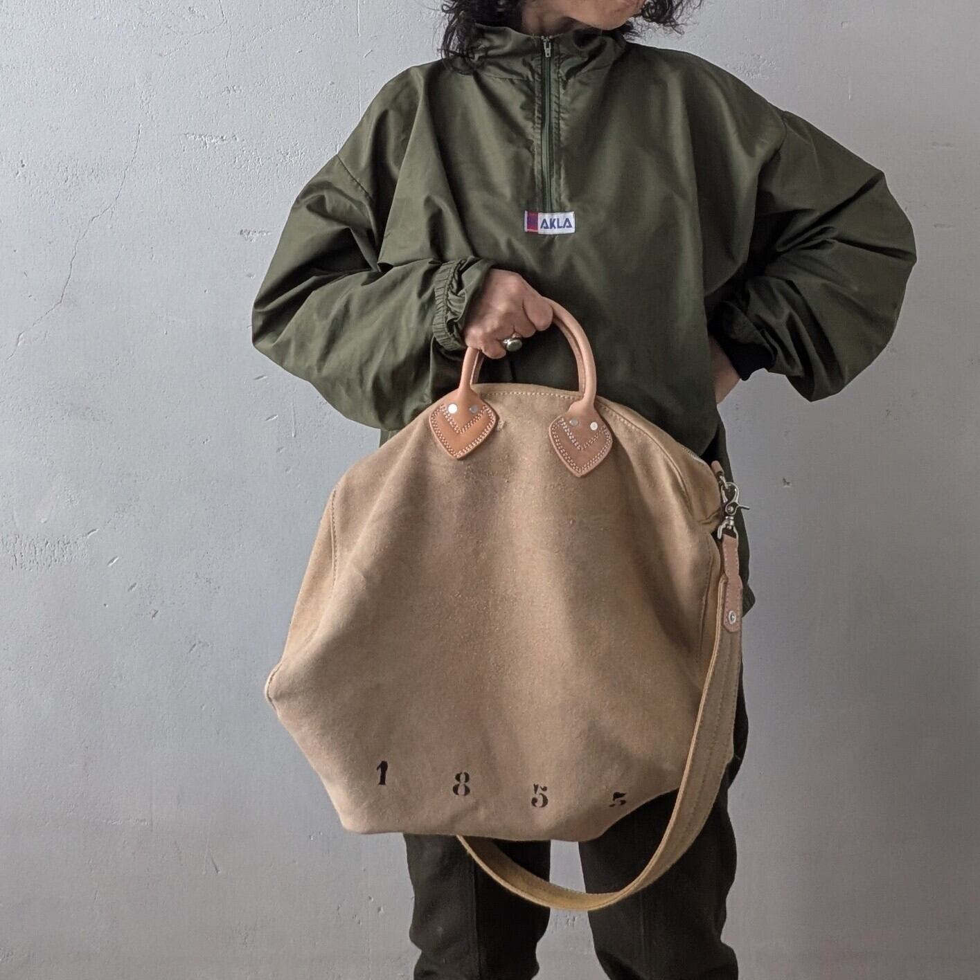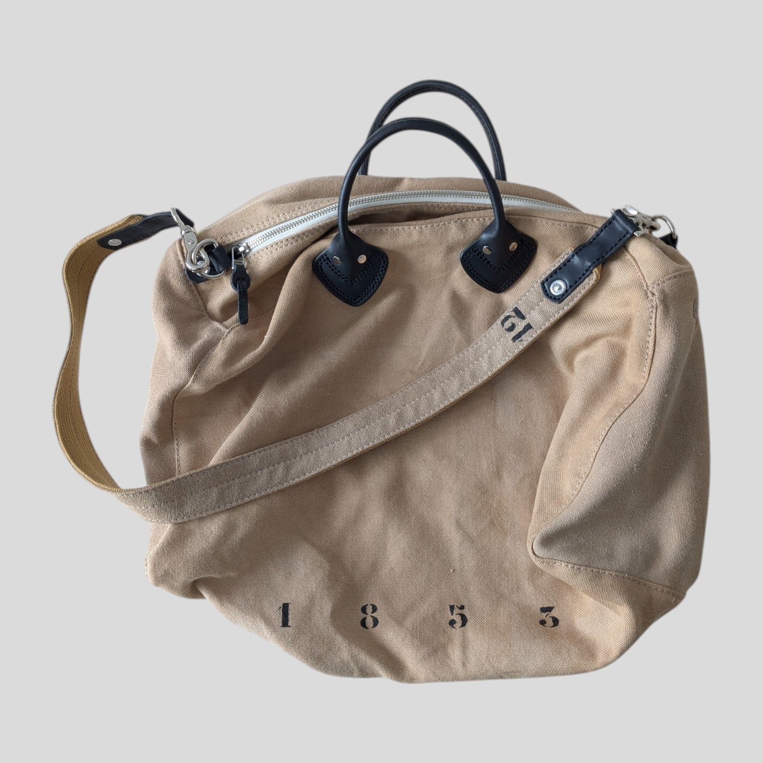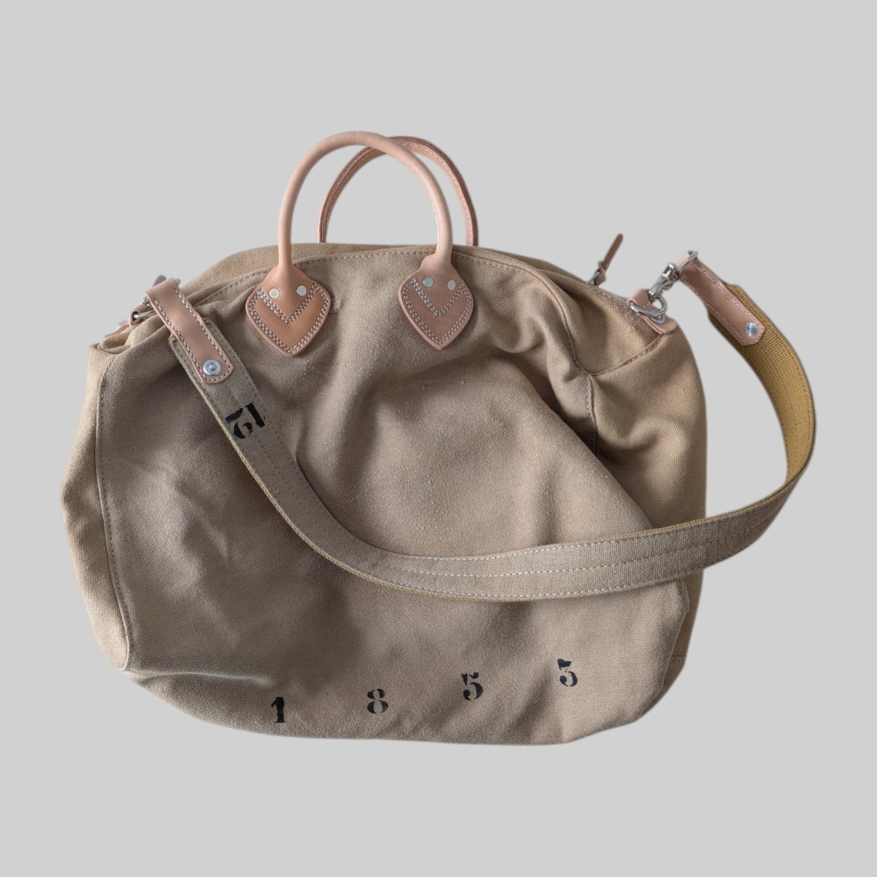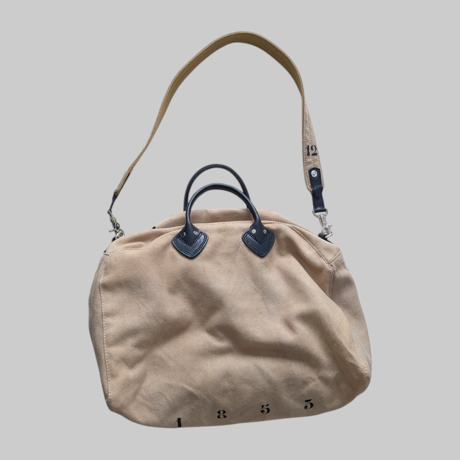 ナンバー"1853"と"12"をさりげなくステンシルで施し、個性的なデザインを演出しています。ハンドルや各パーツには高品質なレザーを使用しており、使い込むほどにその魅力が増していきます。取外し可能なショルダーストラップ付きで、便利にお使いいただけます。