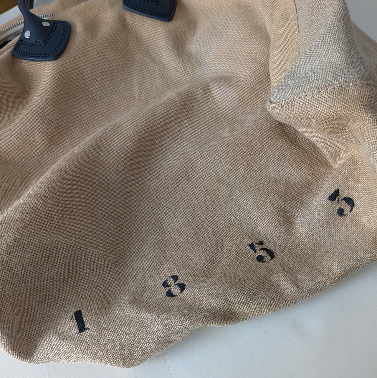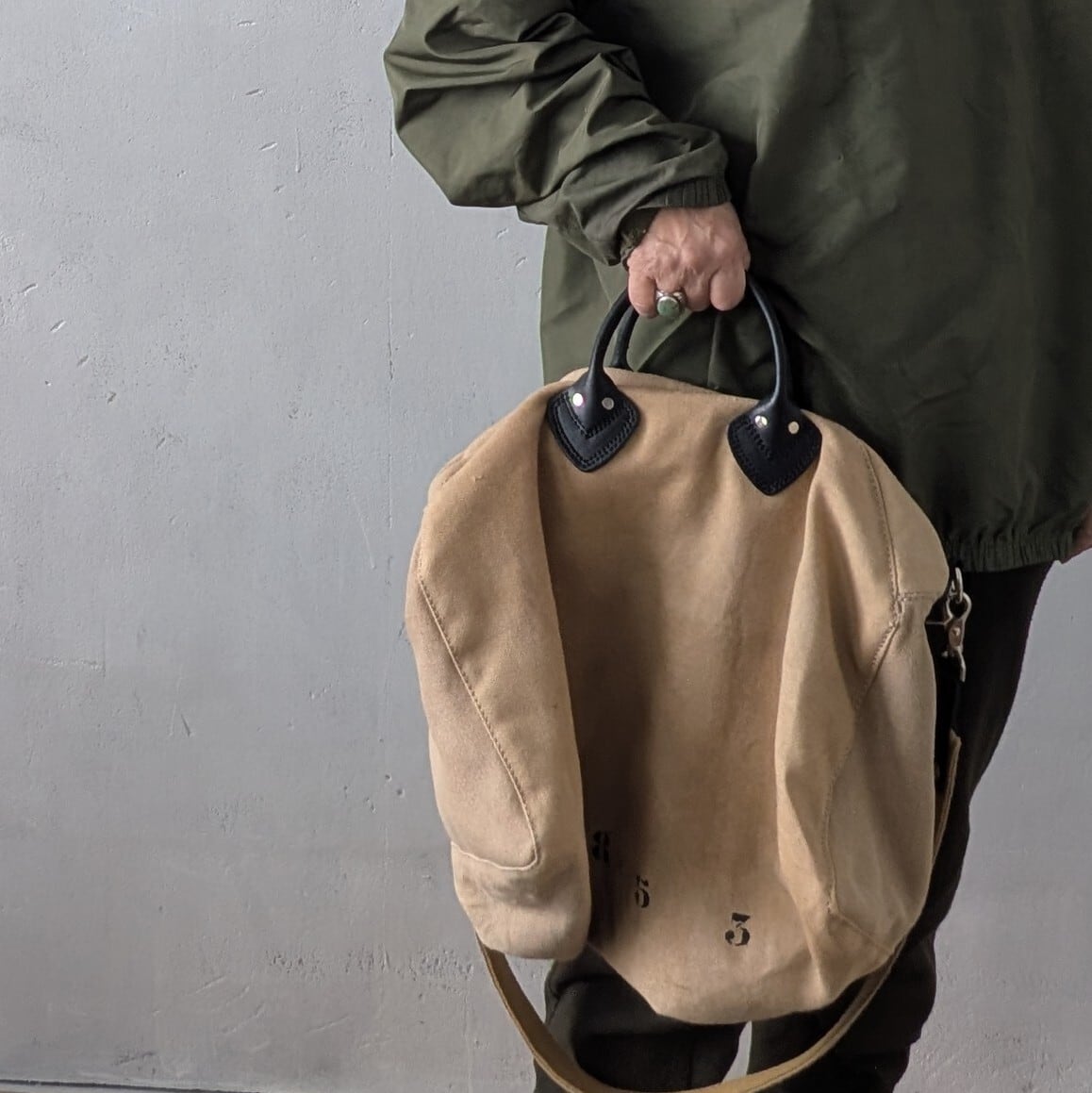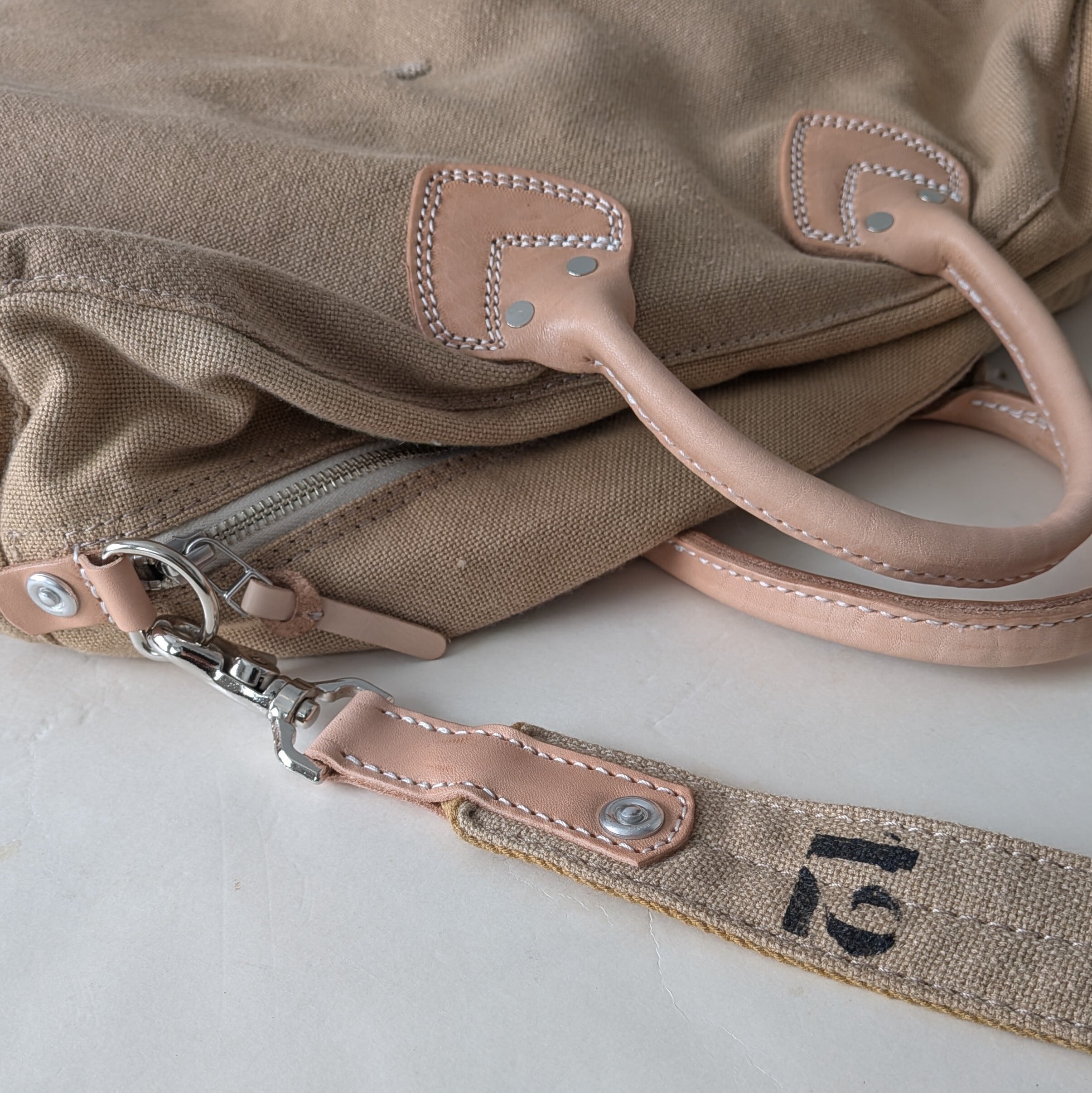 ナンバー"1853"と"12"をさりげなくステンシルで施し、個性的なデザインを演出しています。ハンドルや各パーツには高品質なレザーを使用しており、使い込むほどにその魅力が増していきます。取外し可能なショルダーストラップ付きで、便利にお使いいただけます。